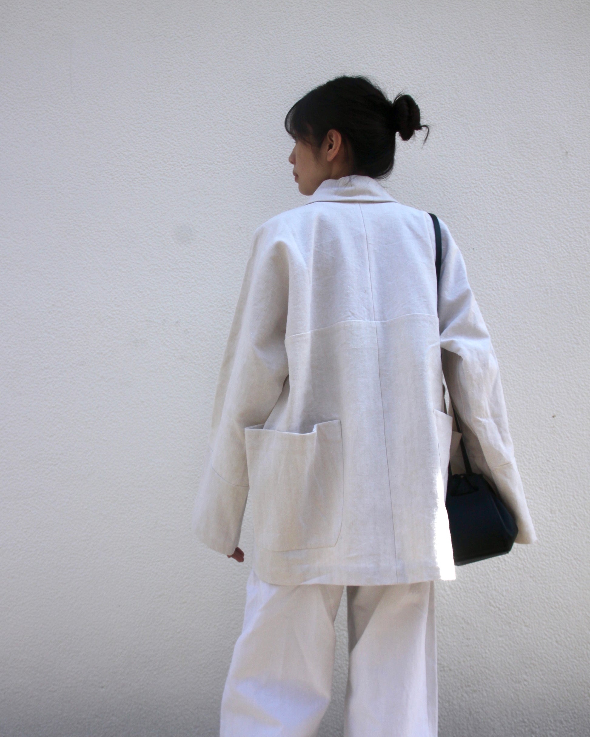 Thanks to its unique cut, which minimises fabric waste, this jacket has no side seams or armholes.