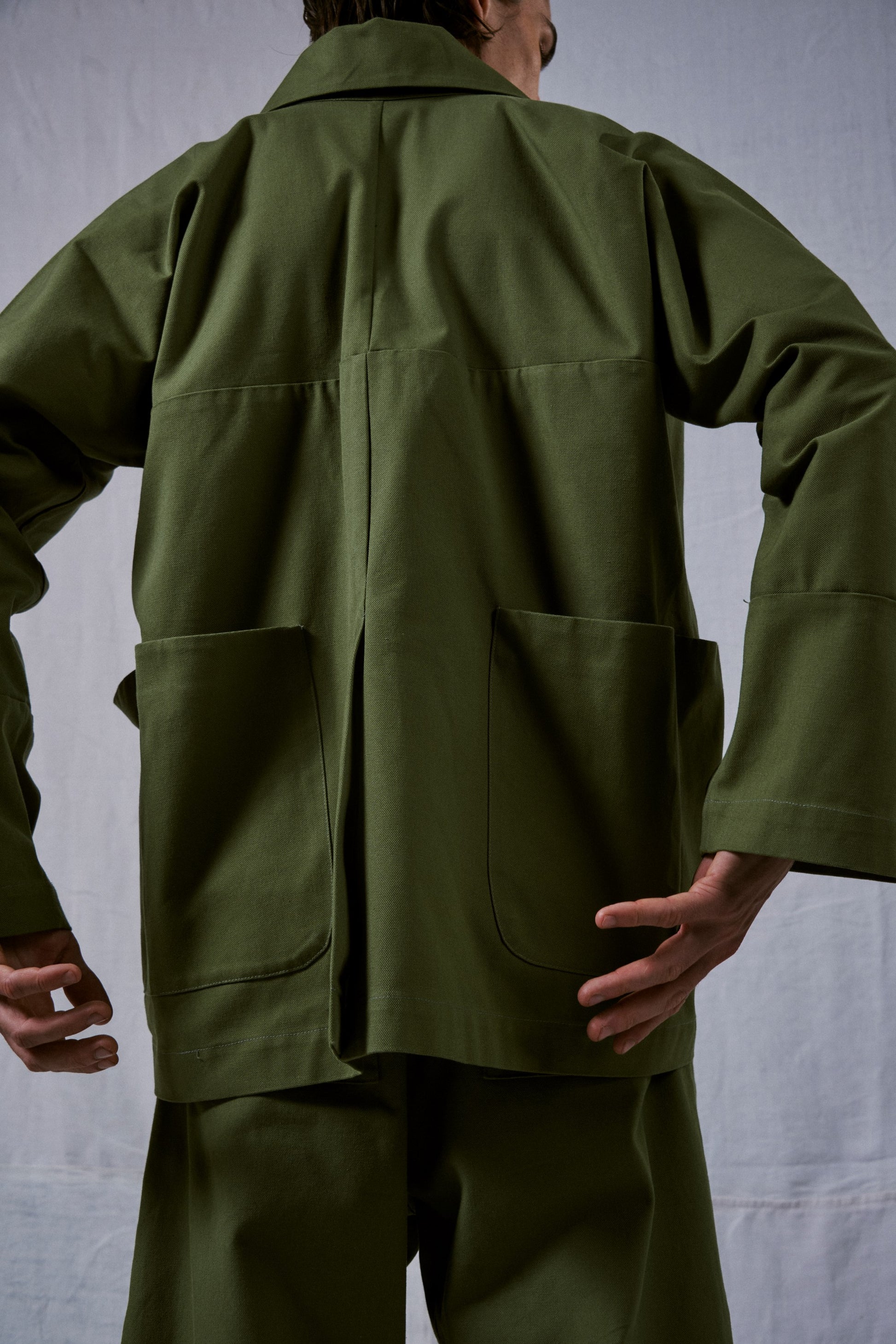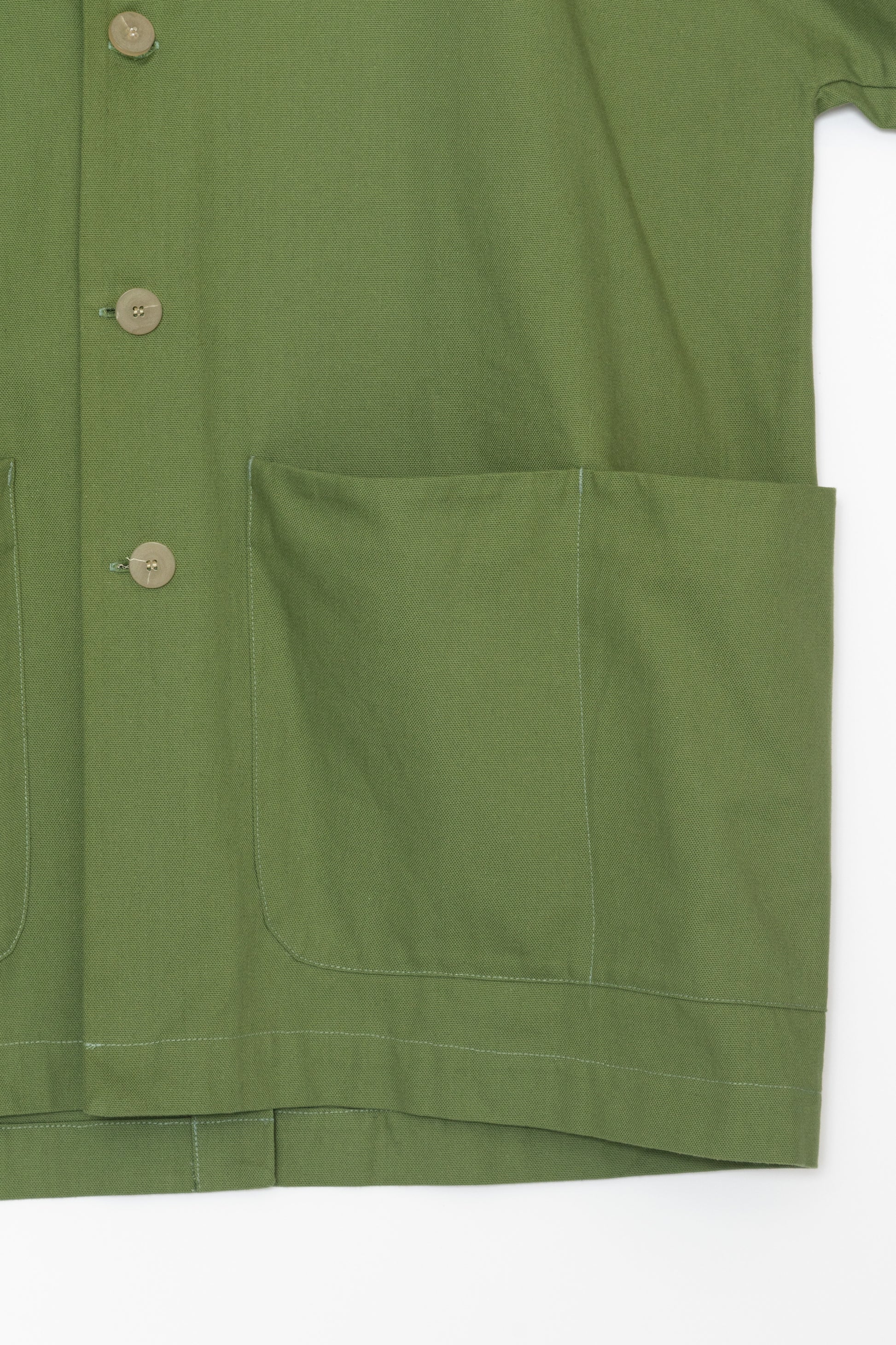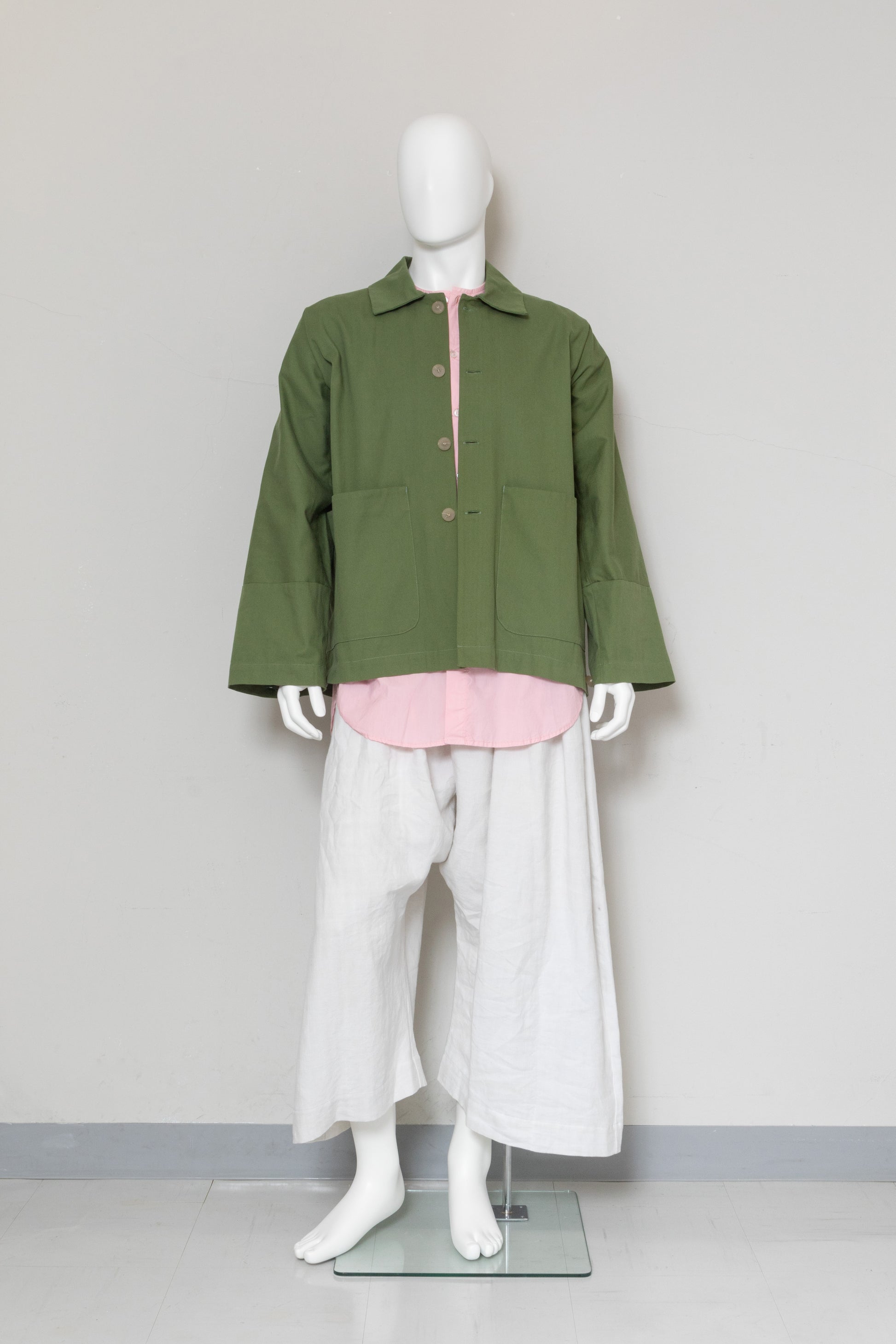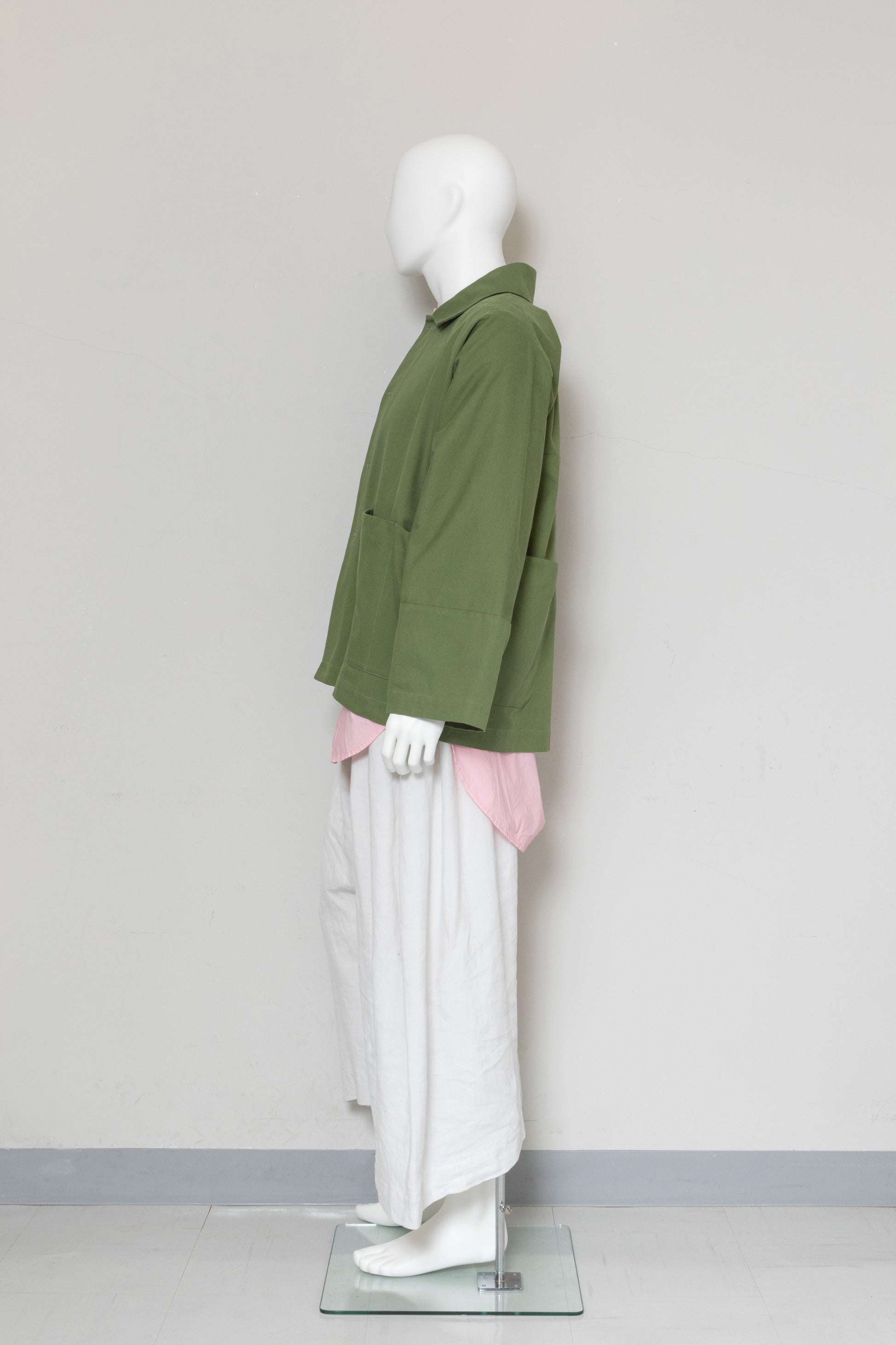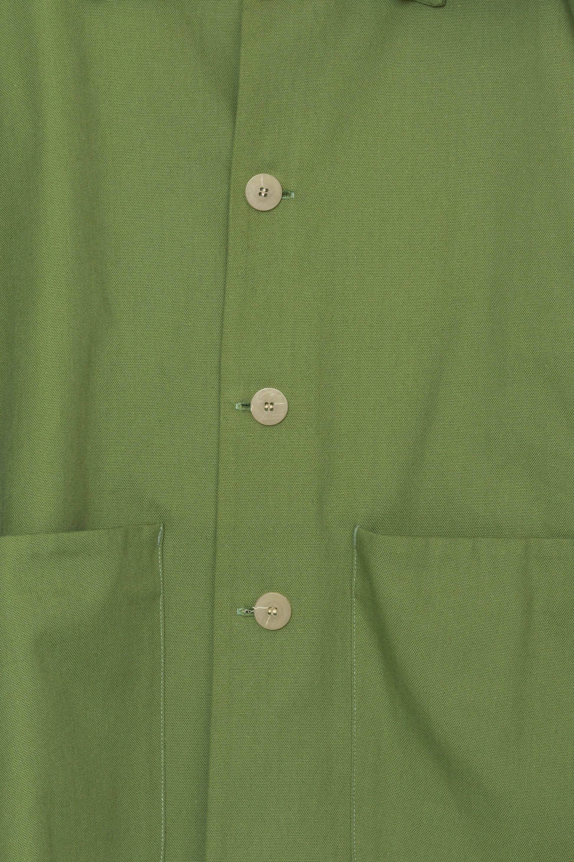 Made from British Brisbane Moss duck fabric. Four buttons on the front. Buttons at the cuffs.