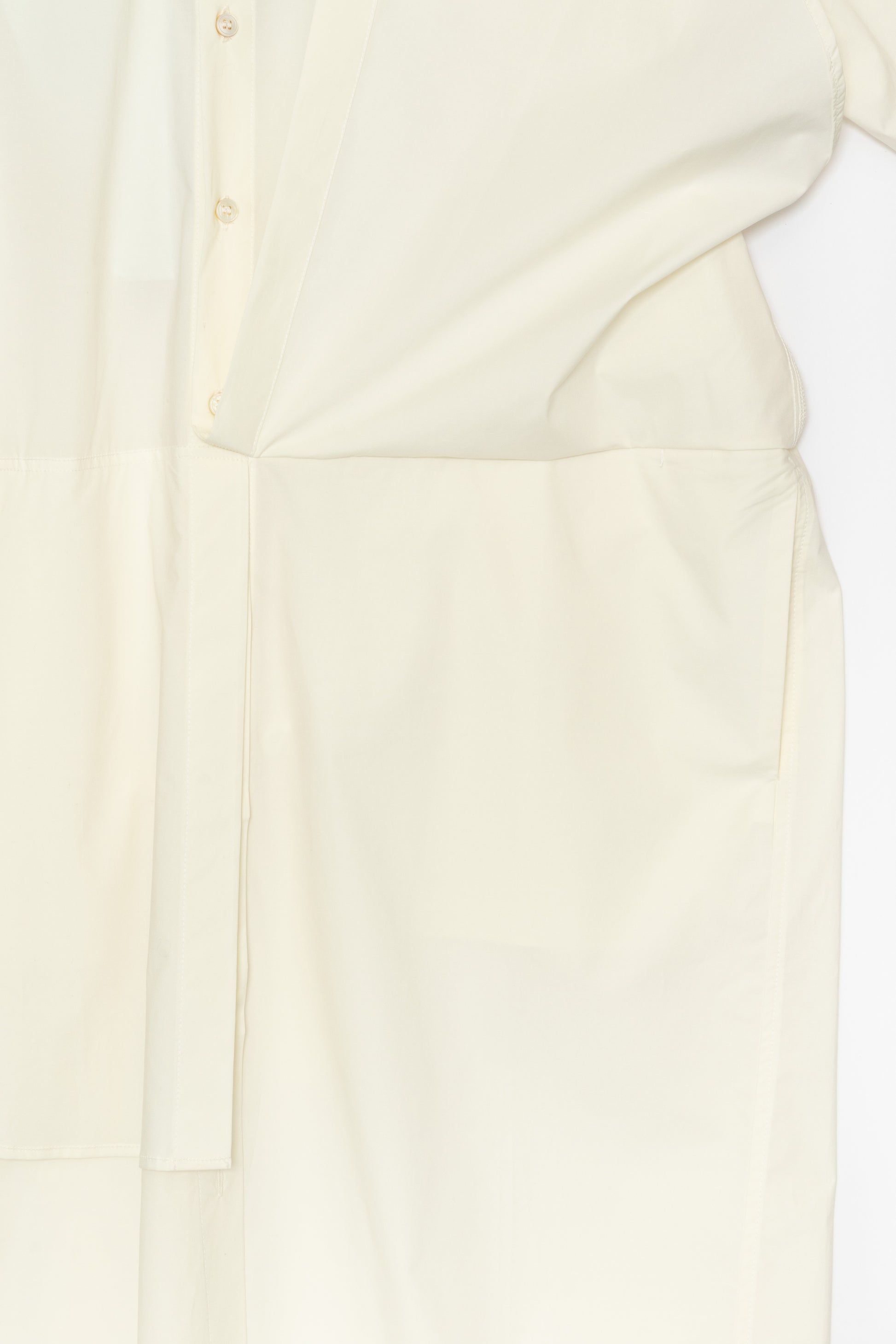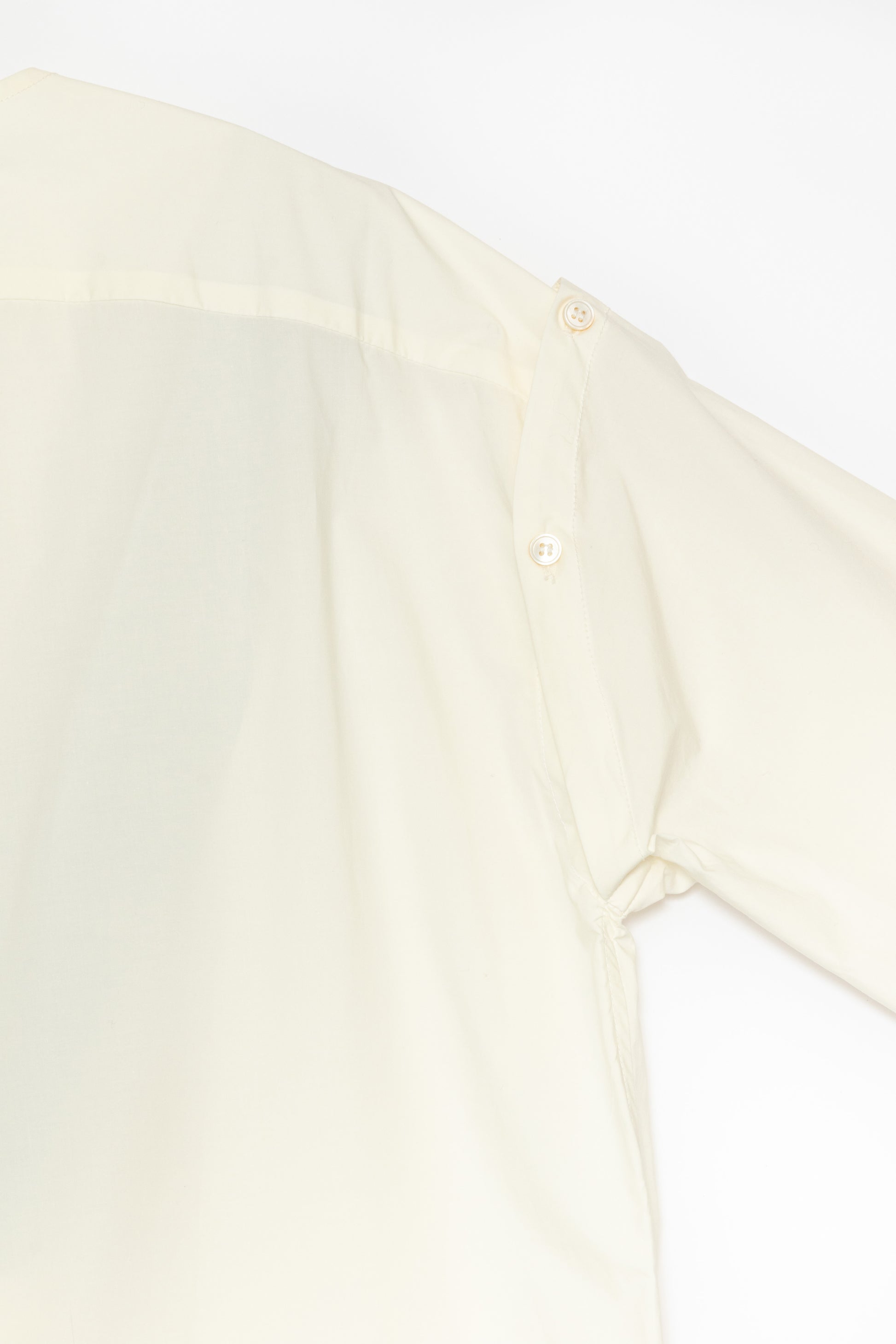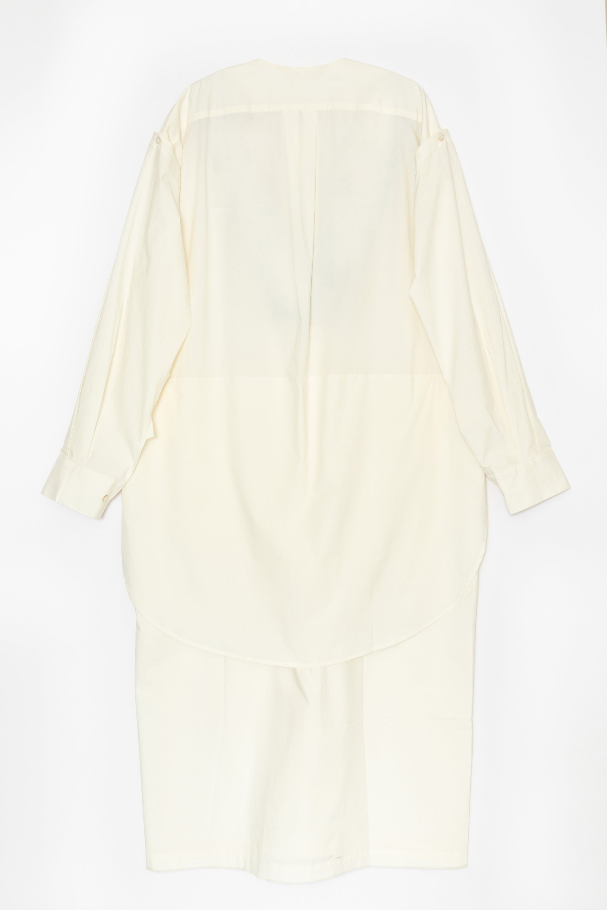 A dress that looks like a layered slab shirt and shirt. A 2-way design that allows you to wear it with the sleeves tied in front by removing the button on the back of the armhole. Made of lightweight Italian cotton fabric with a slight crispness. With slit pockets on the sides.