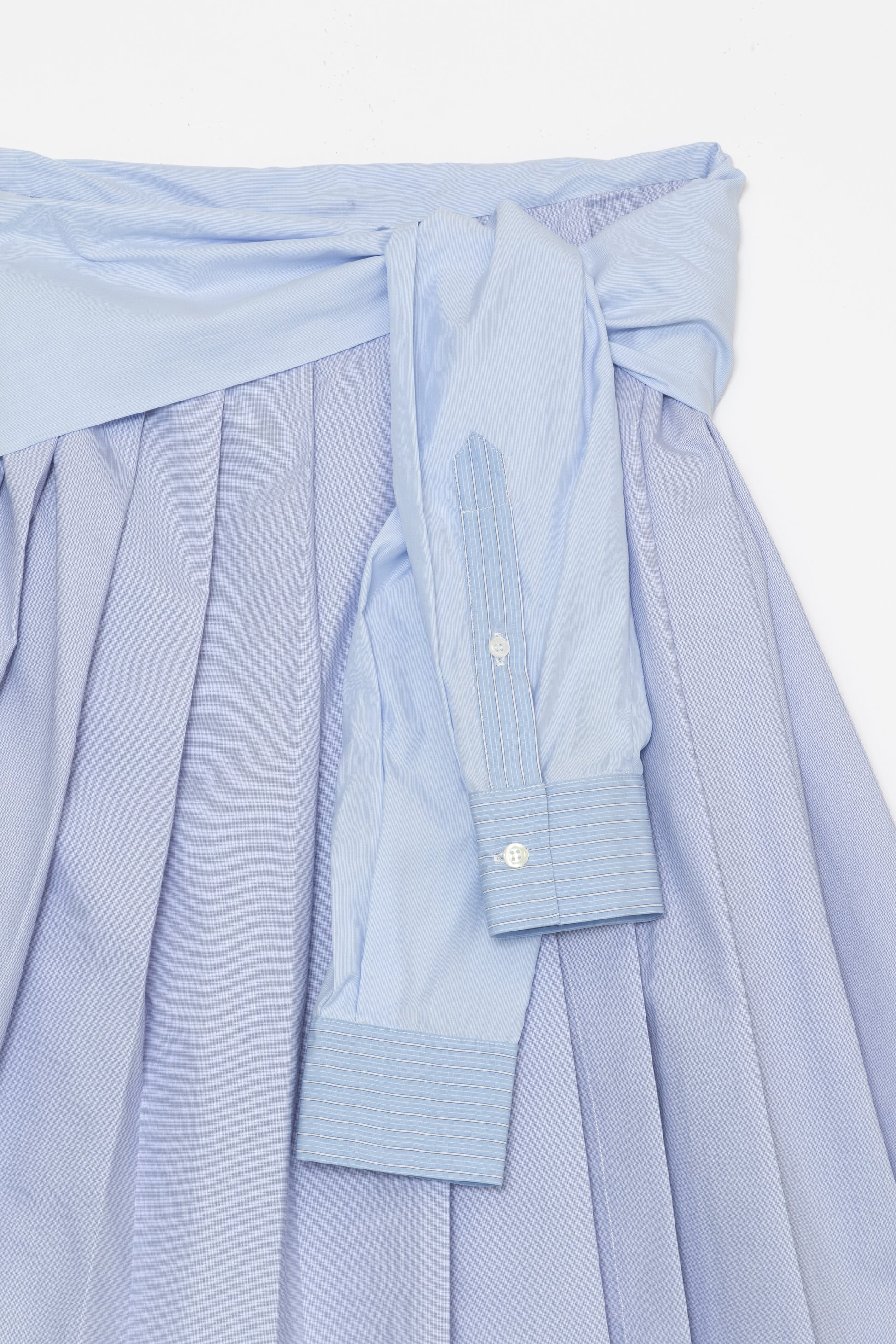 A unisex pleated quilt that combines micro-check and two types of striped cotton fabric. This wrap skirt is an arrangement of the traditional Scottish costume kilt. Accented with a belt that resembles the sleeves of a shirt. We use 100% cotton fabric from Portugal.
