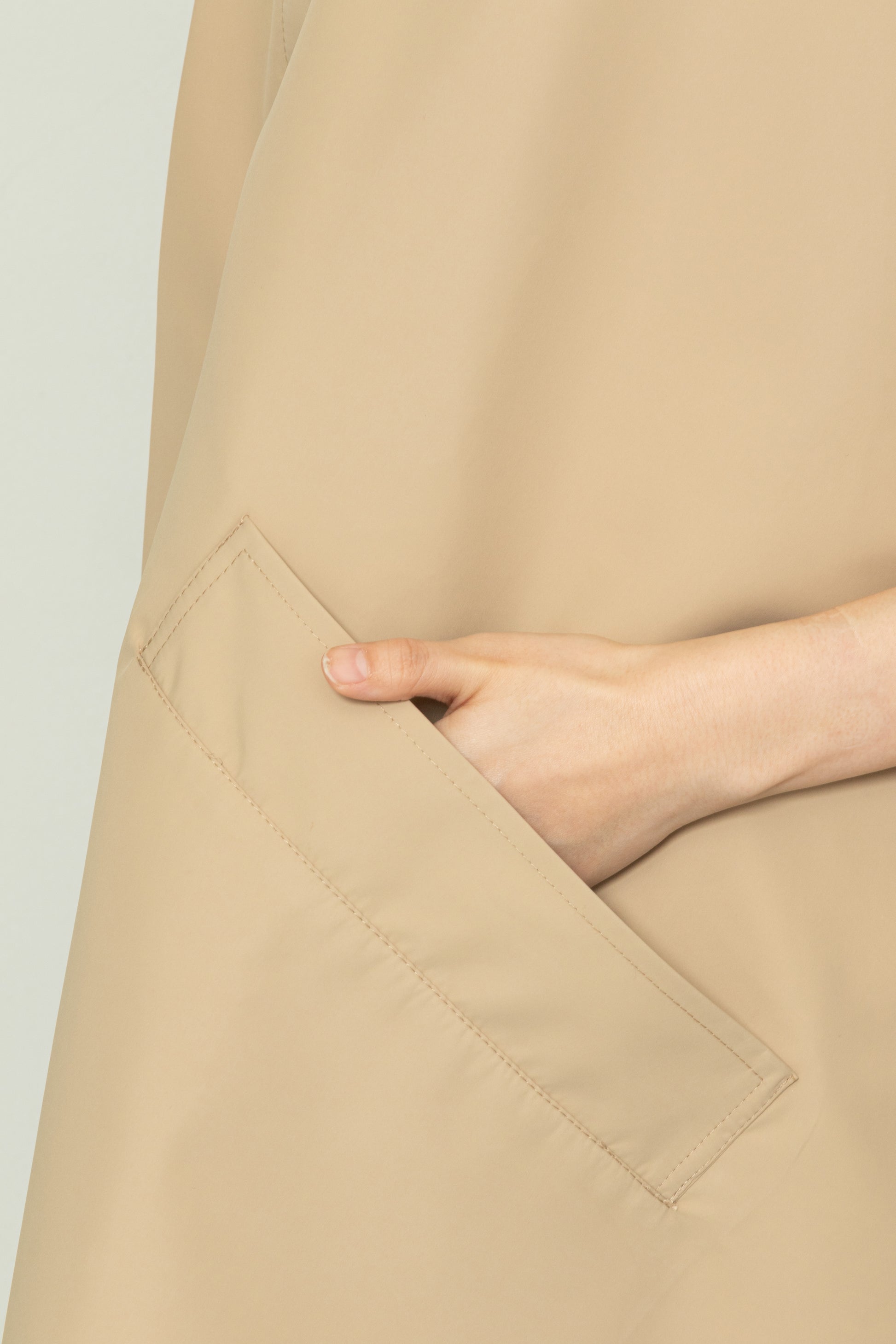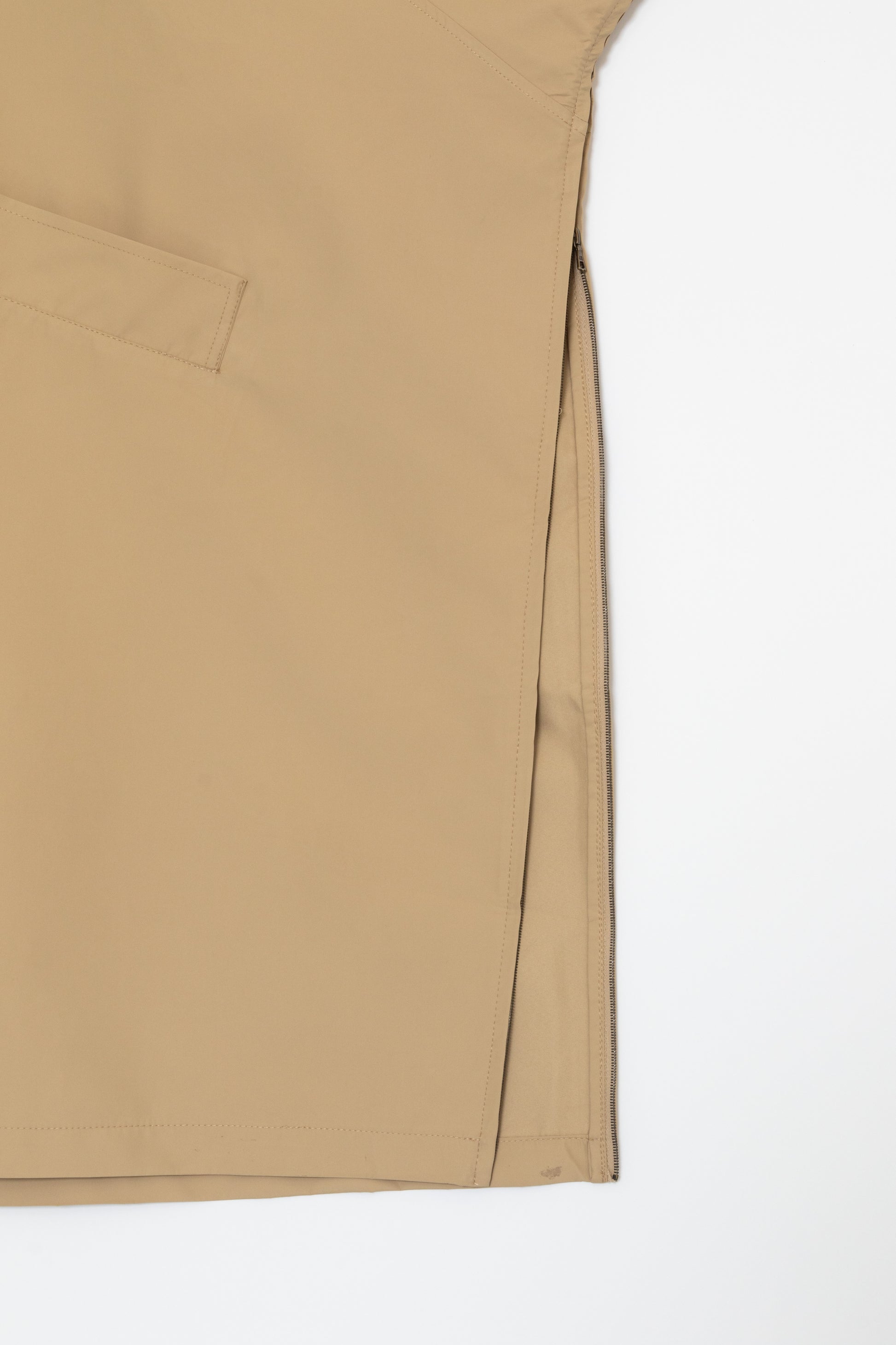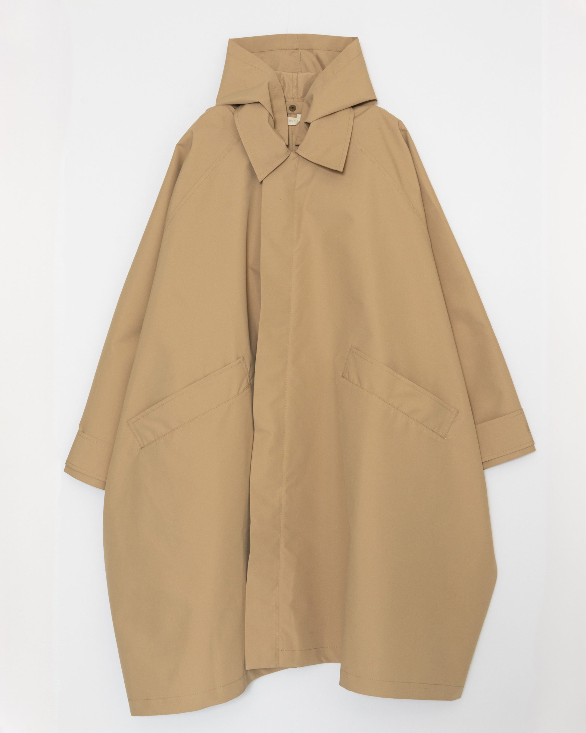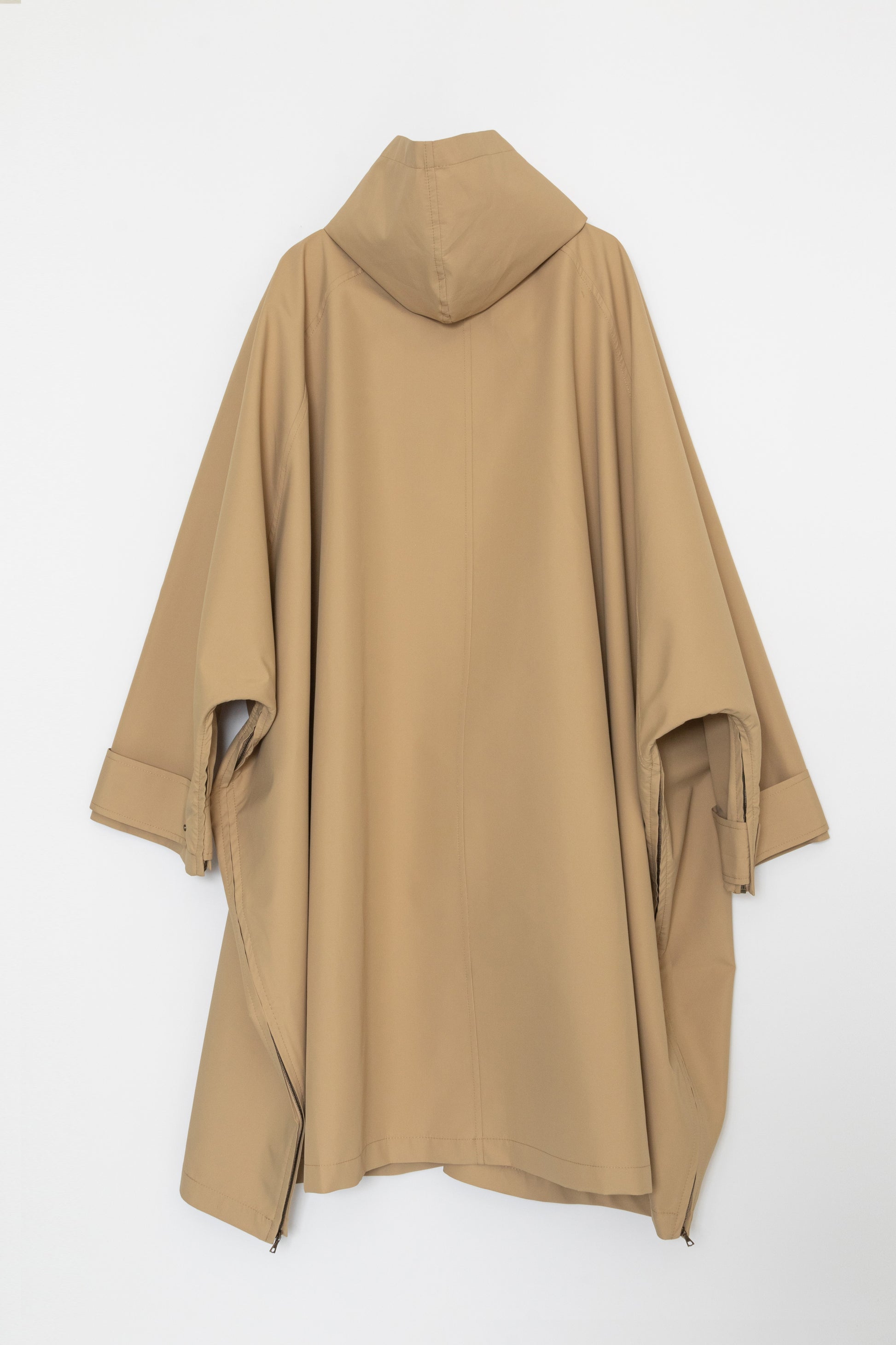 A unisex coat made of water-repellent fabric. Hood is removable. The front zip opens and closes with a snap button. The side can be opened wide with a zip. When the zip is opened from the hem to the armpit, the designer creates the most beautiful silhouette. With a large pocket on the front.