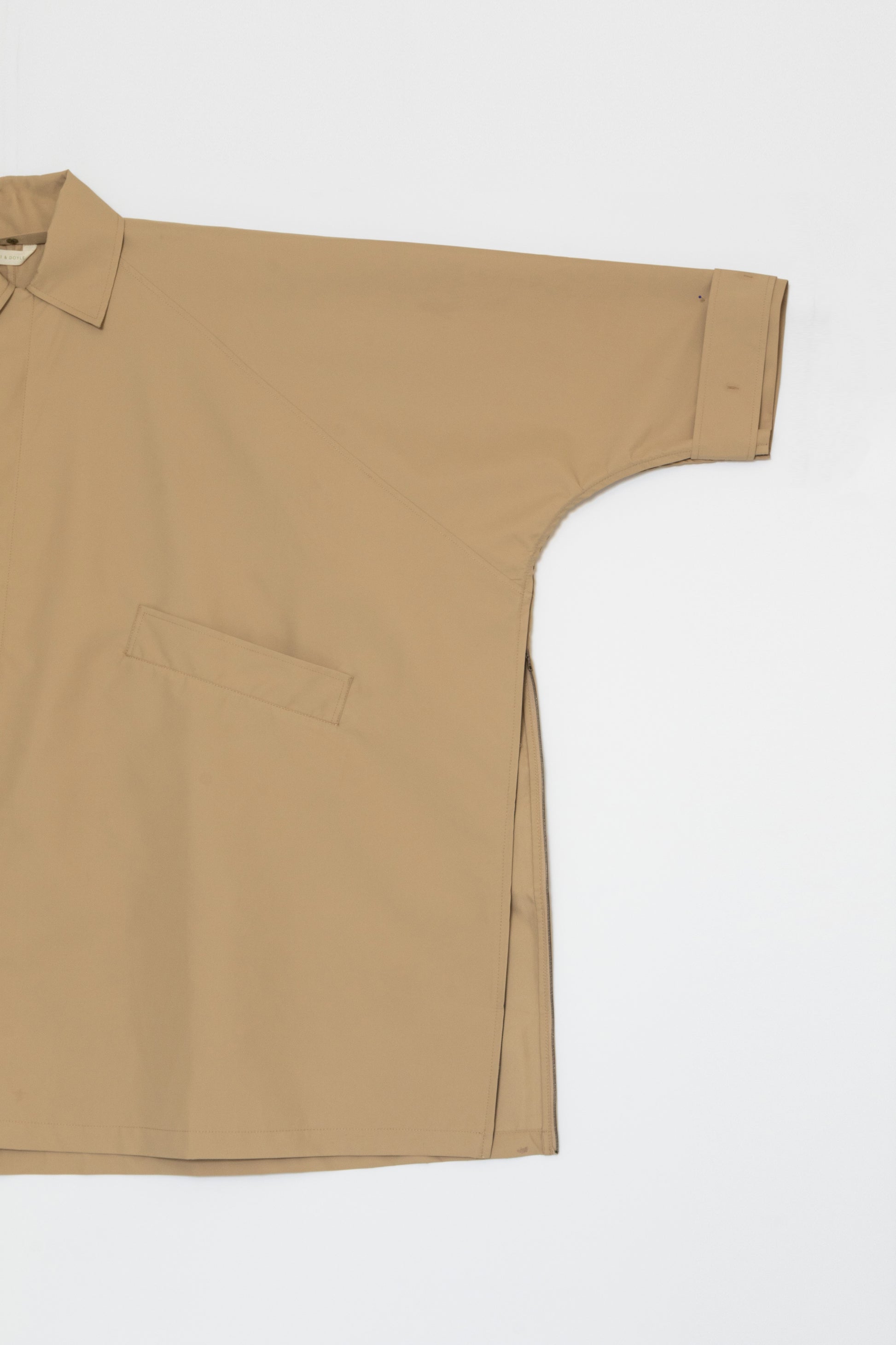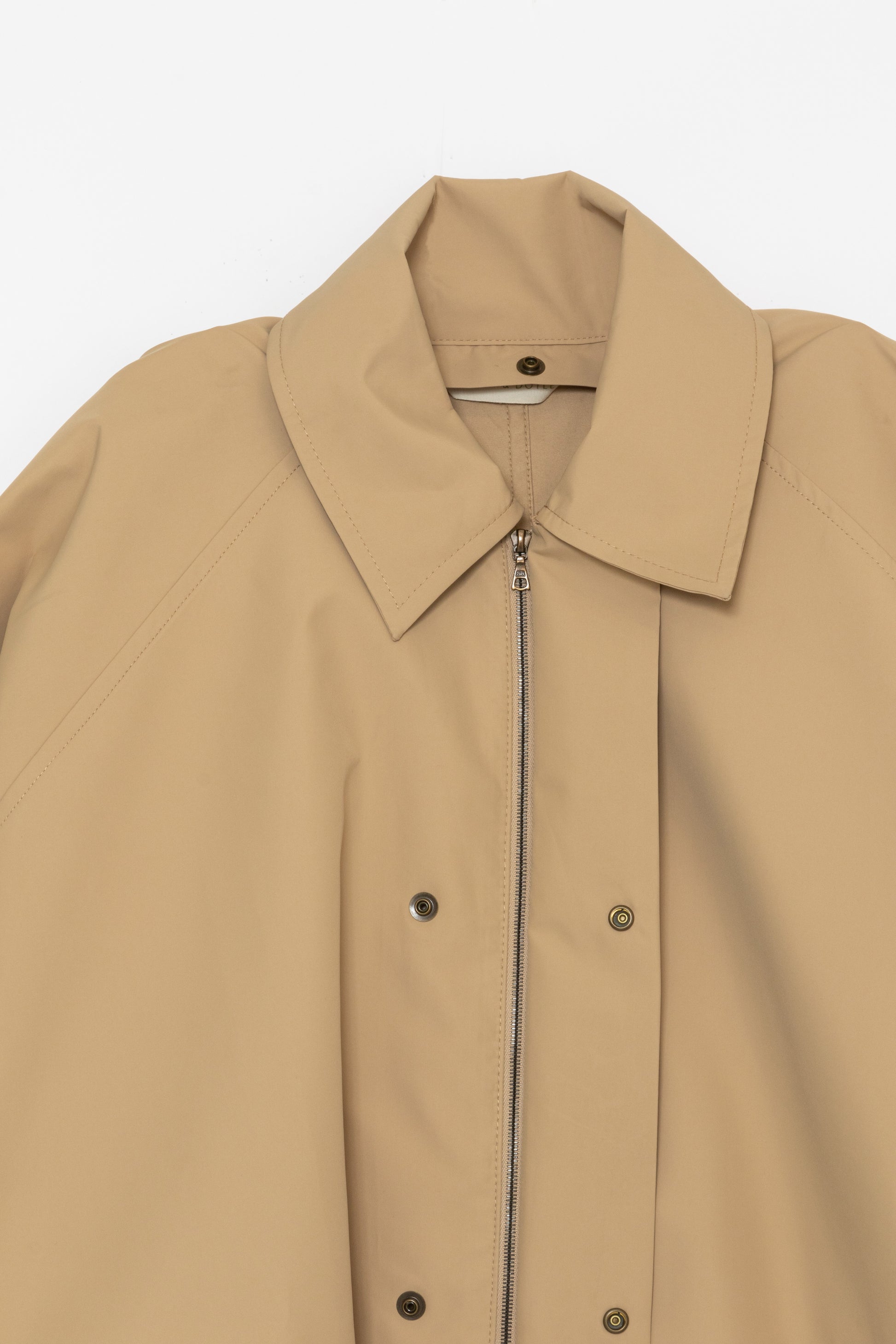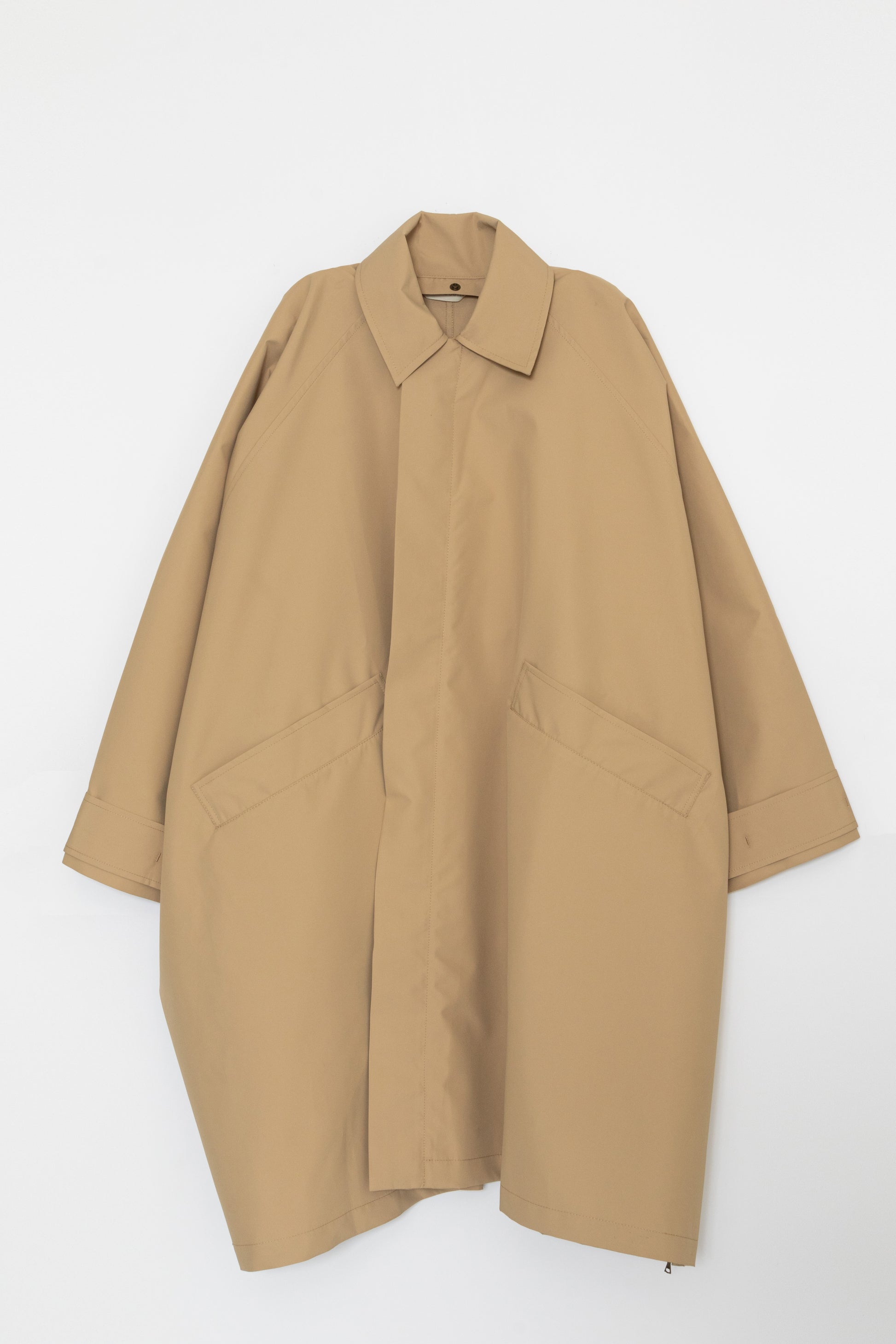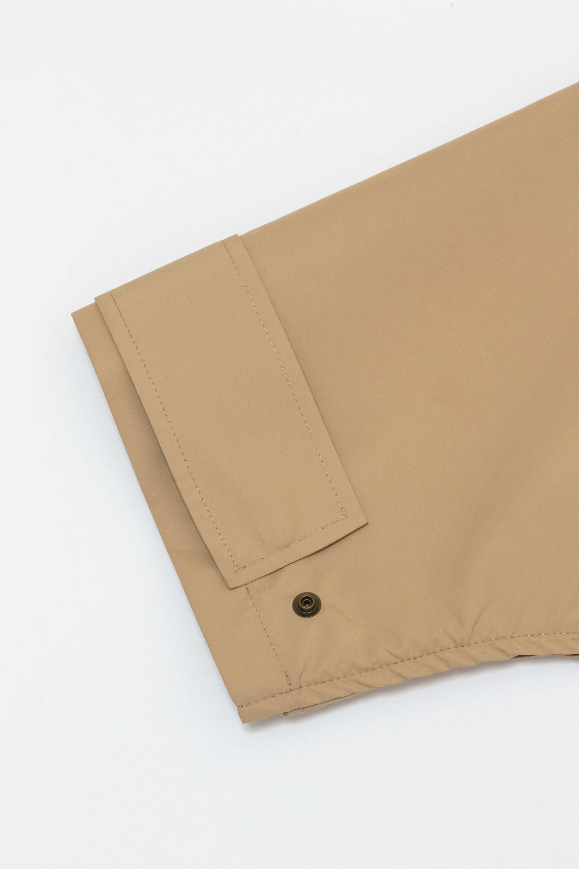 A unisex coat made of water-repellent fabric. Hood is removable. The front zip opens and closes with a snap button. The side can be opened wide with a zip. When the zip is opened from the hem to the armpit, the designer creates the most beautiful silhouette. With a large pocket on the front.