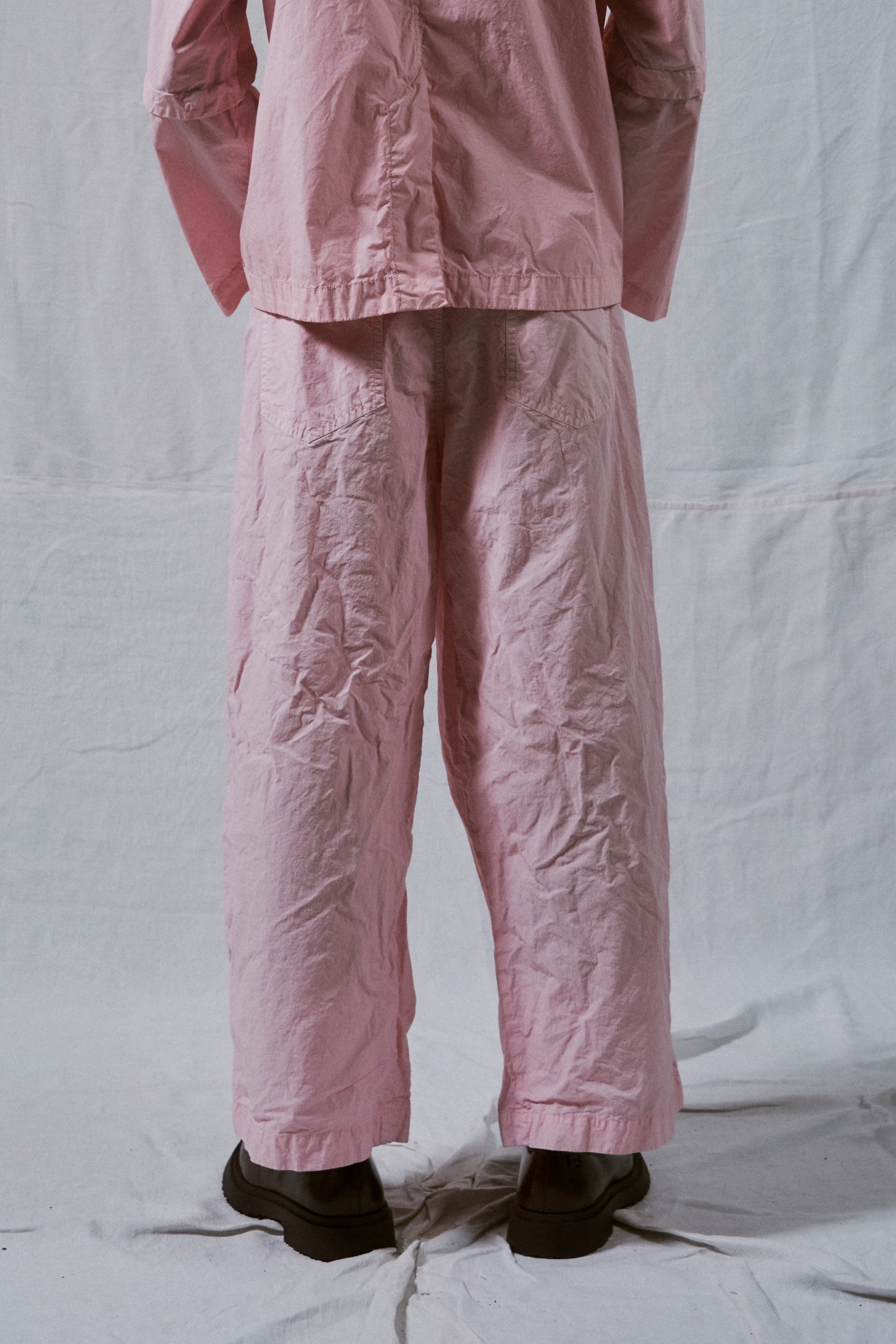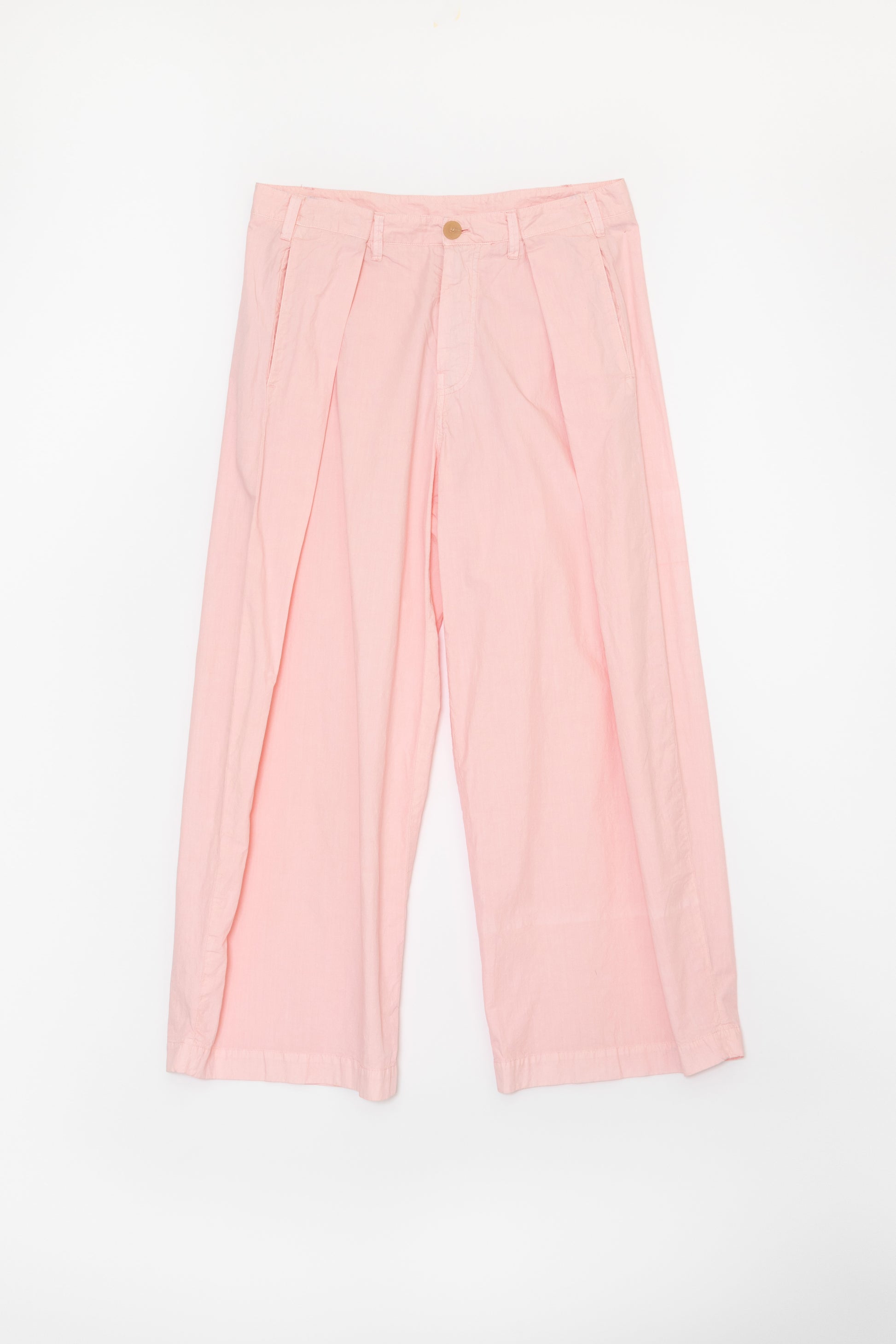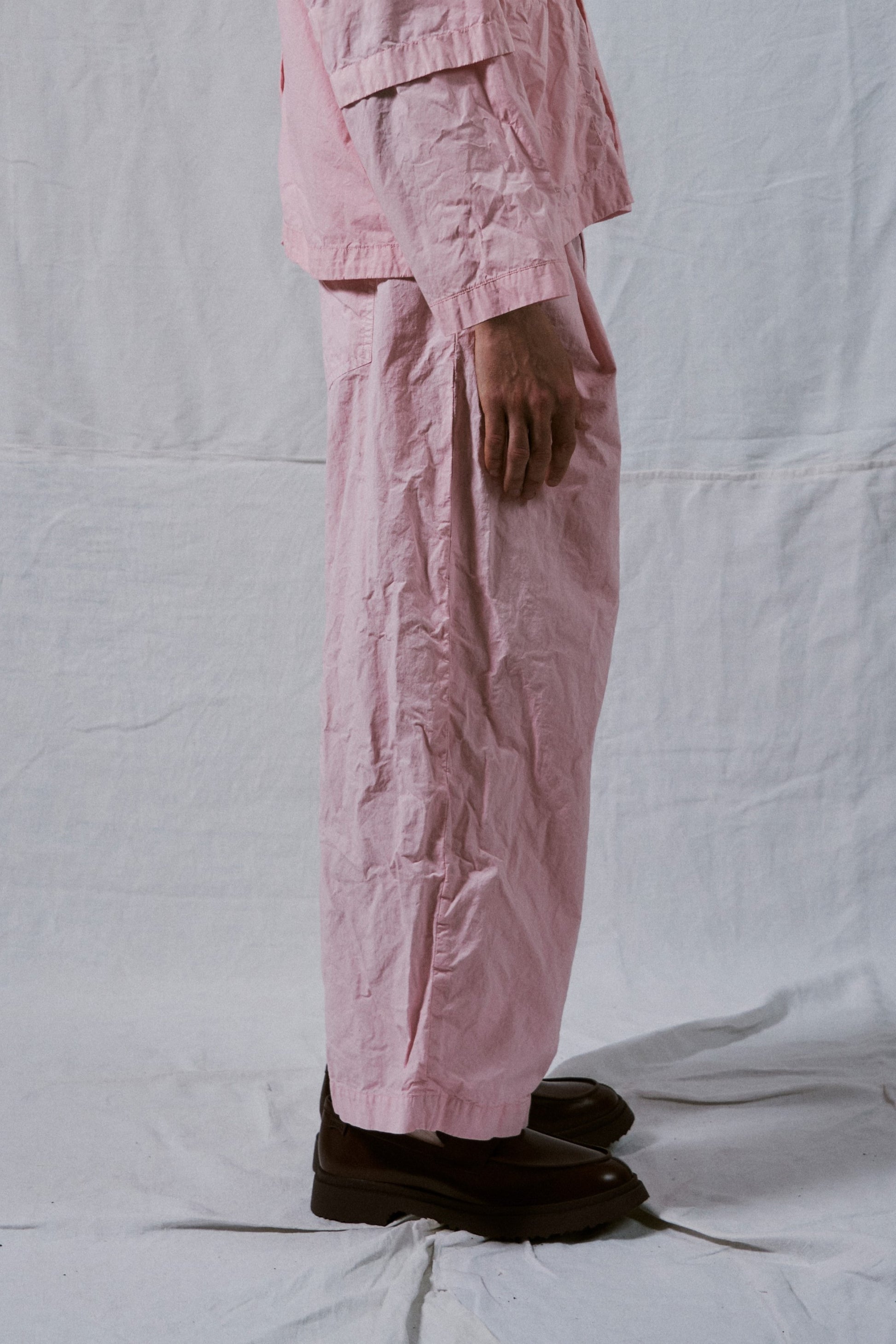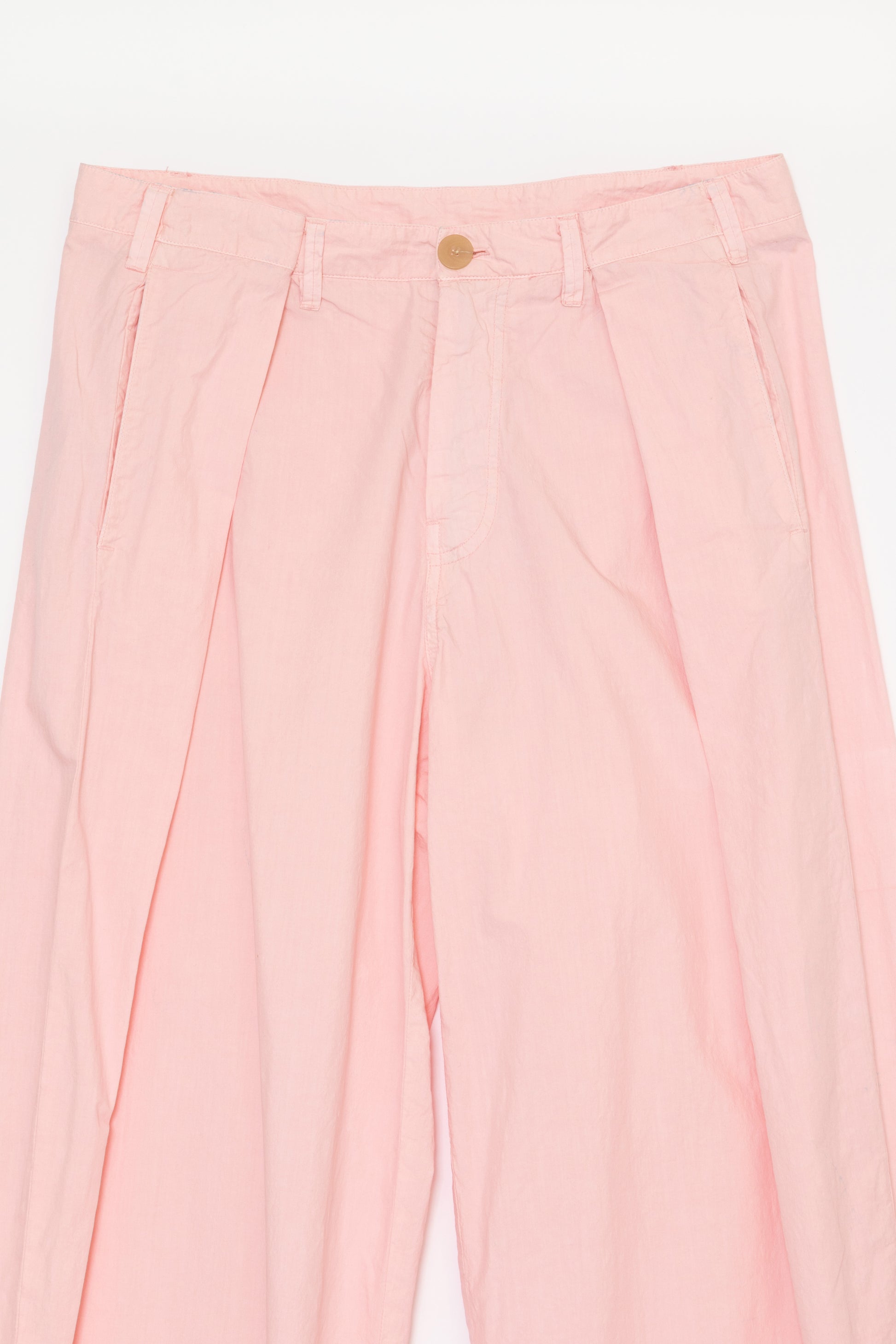 Unisex trousers. Features a sculptural silhouette with deep single pleats facing inward. The product is dyed using crisp Italian cotton Tencel fabric. It has side pockets and back pockets.