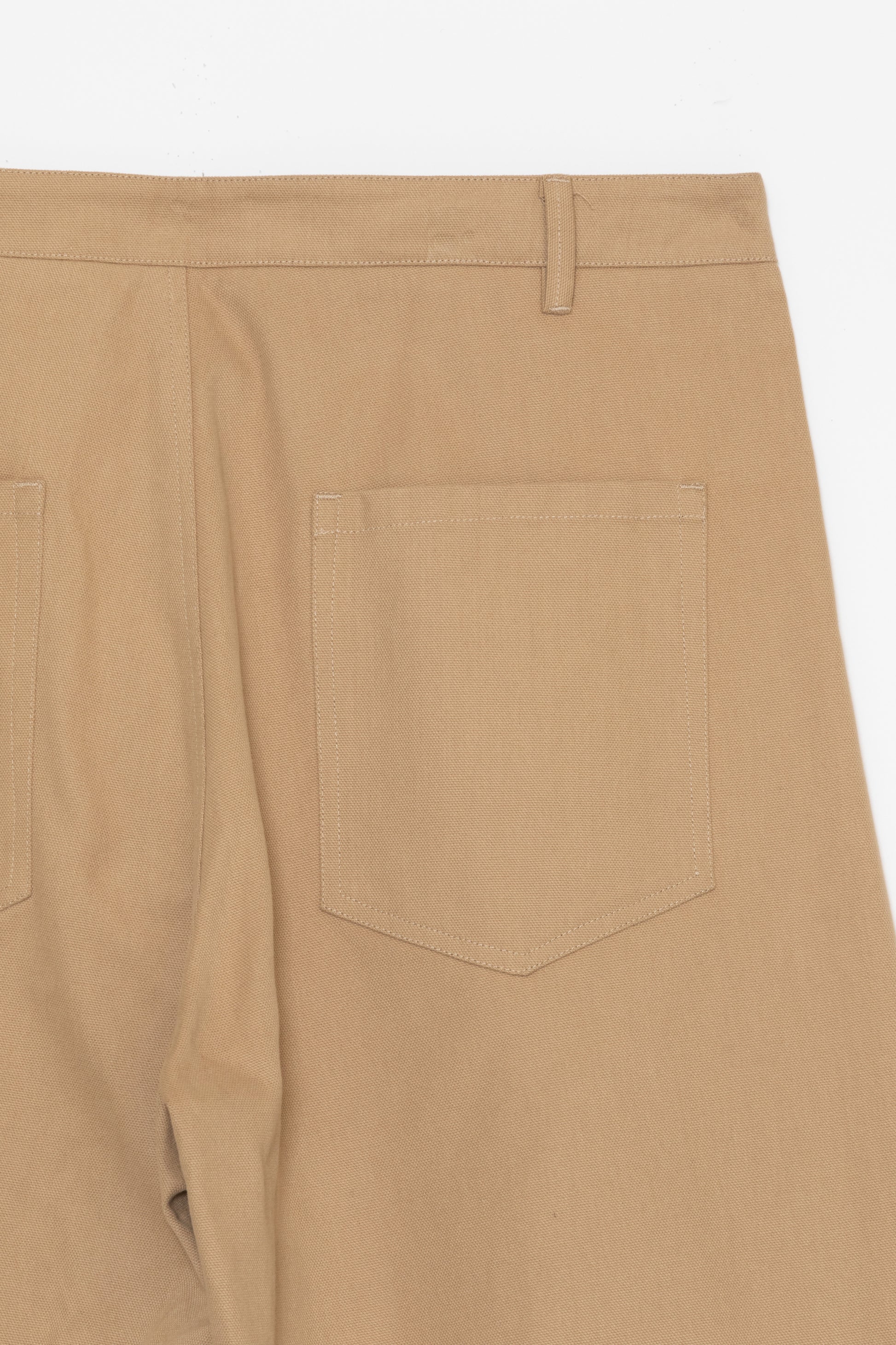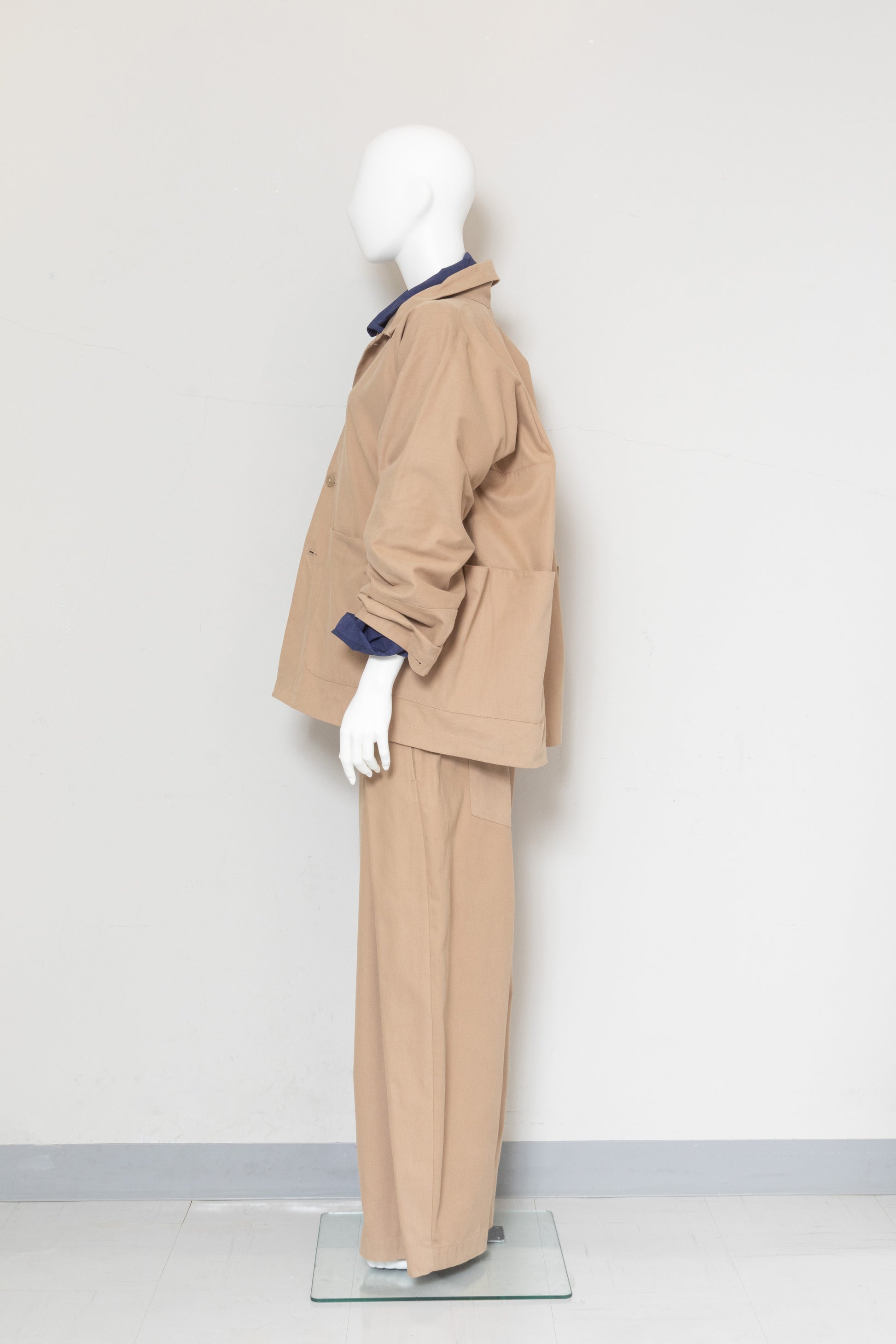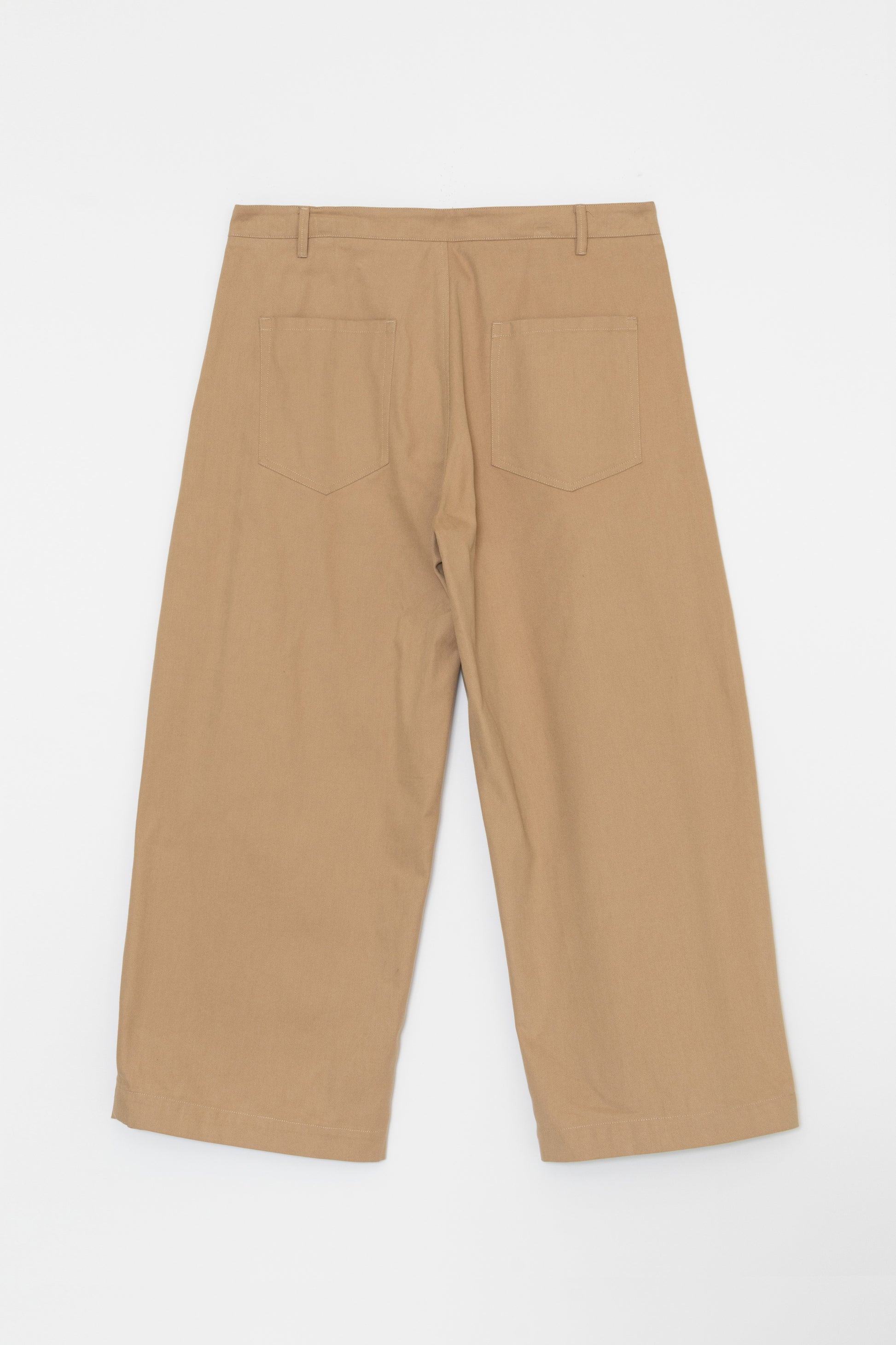 Unisex trousers. Deep single pleats facing inwards create a sculptural silhouette. Made from Brisbane Moss duck fabric in the UK. Made from the same fabric as the BUOY JACKET - HAY, they can be worn as a set. Side and back pockets.
