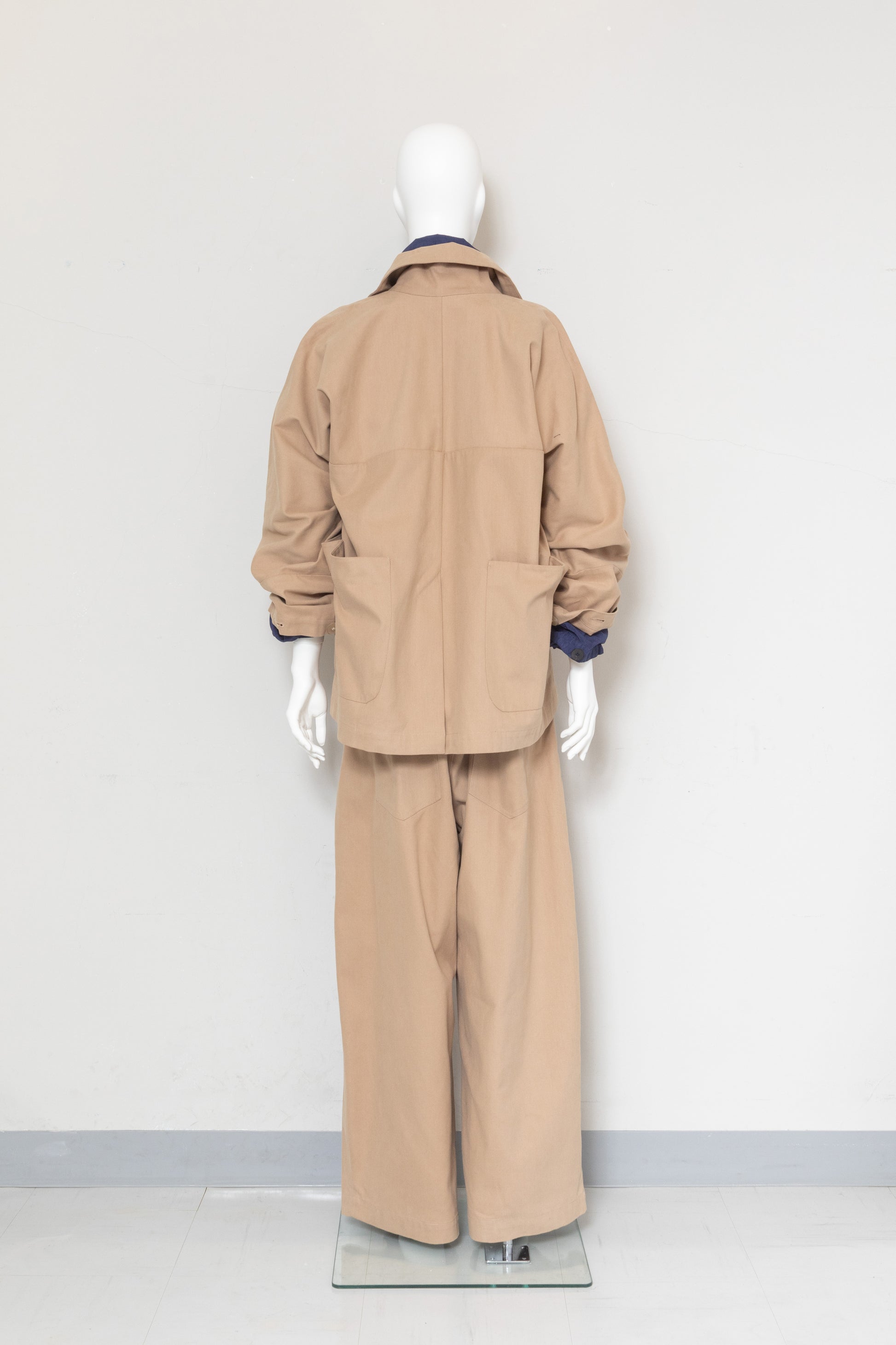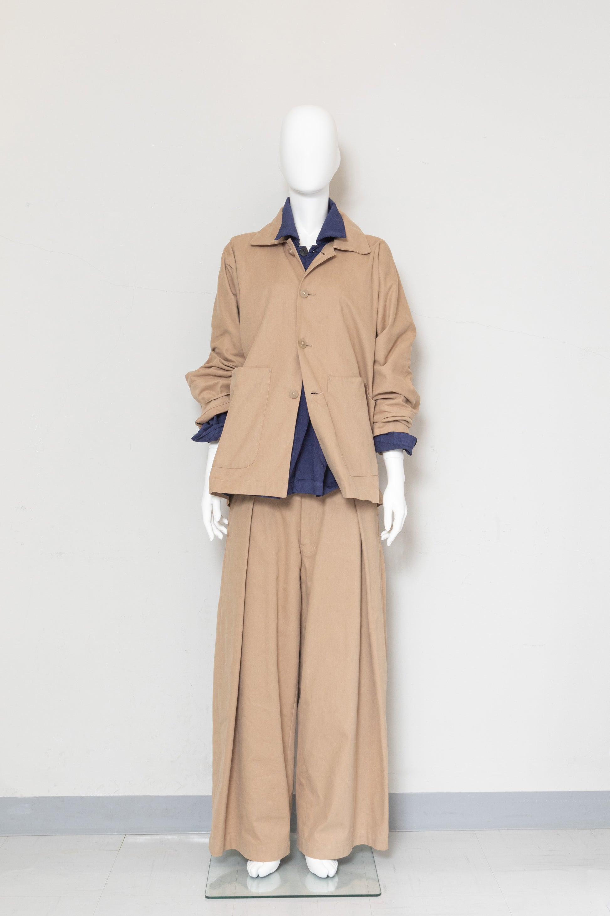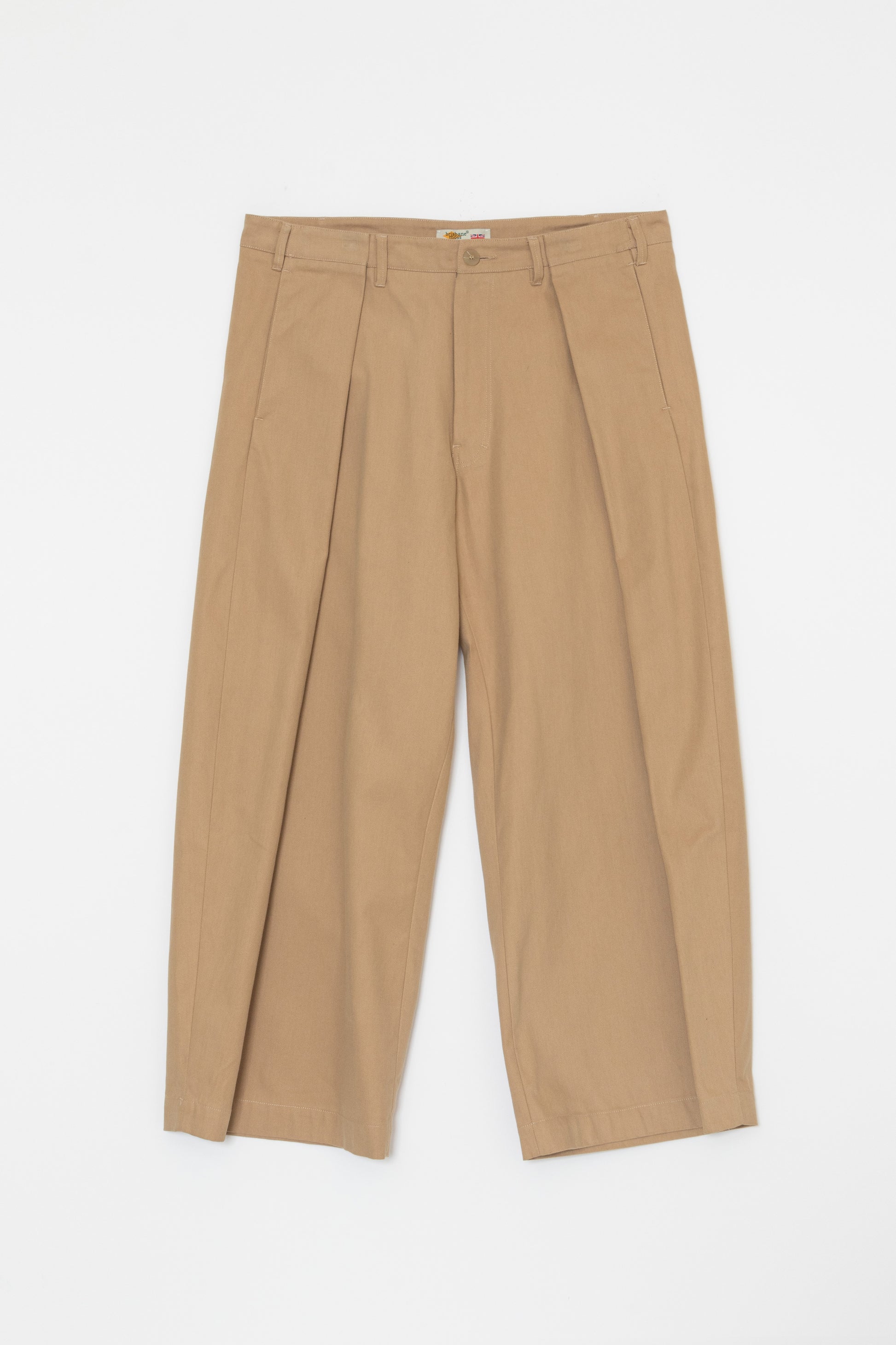 Unisex trousers. Deep single pleats facing inwards create a sculptural silhouette. Made from Brisbane Moss duck fabric in the UK. Made from the same fabric as the BUOY JACKET - HAY, they can be worn as a set. Side and back pockets.