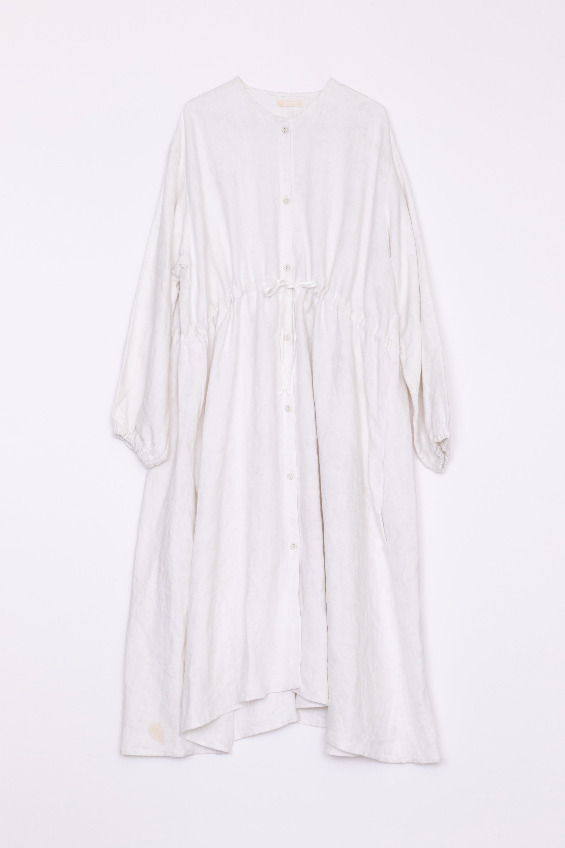 ドローコードとフロントボタン付きのワンピース。 サイドシームポケットが付いています。 ロングコートとして着用することも、ドレスとして着用することも可能です。