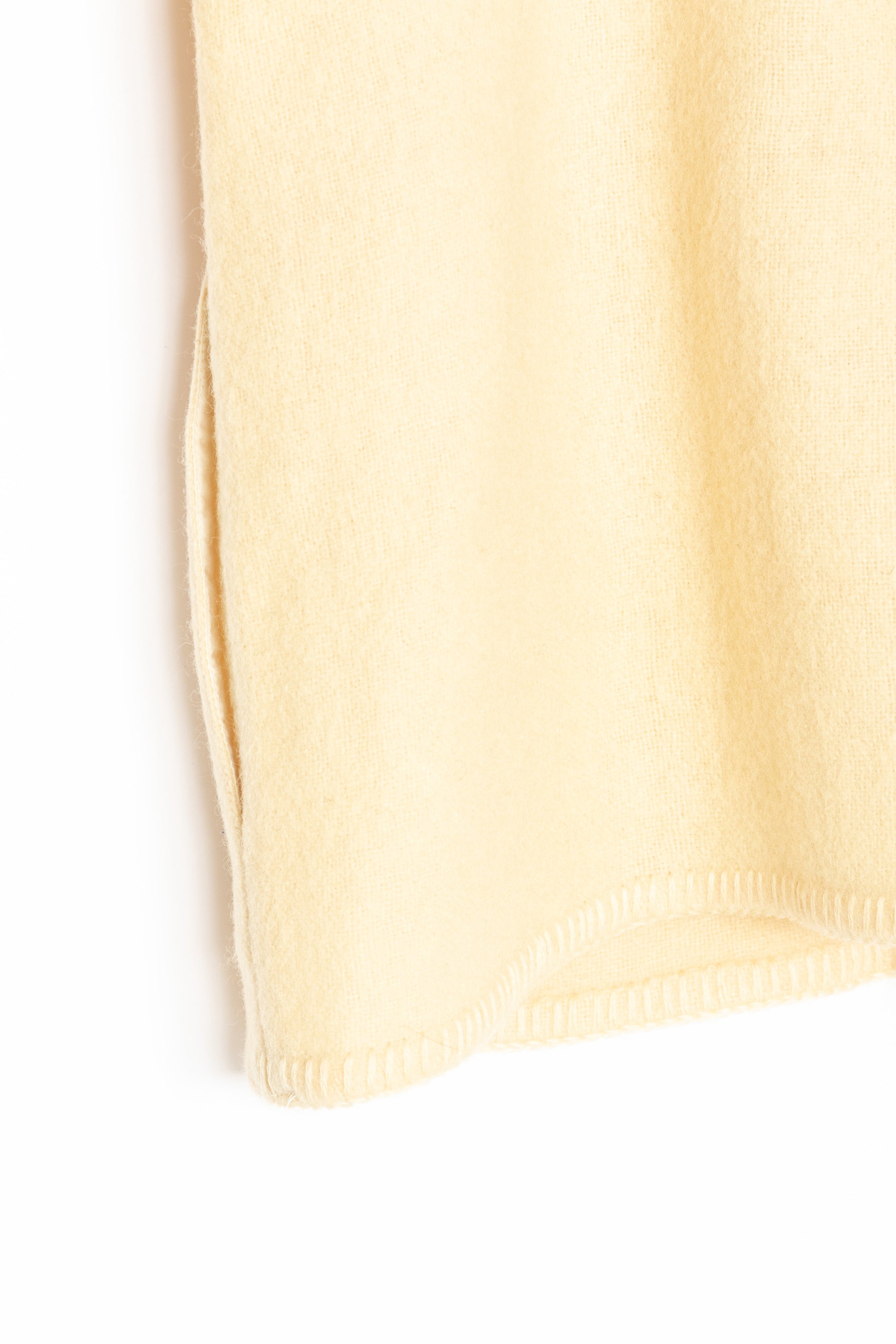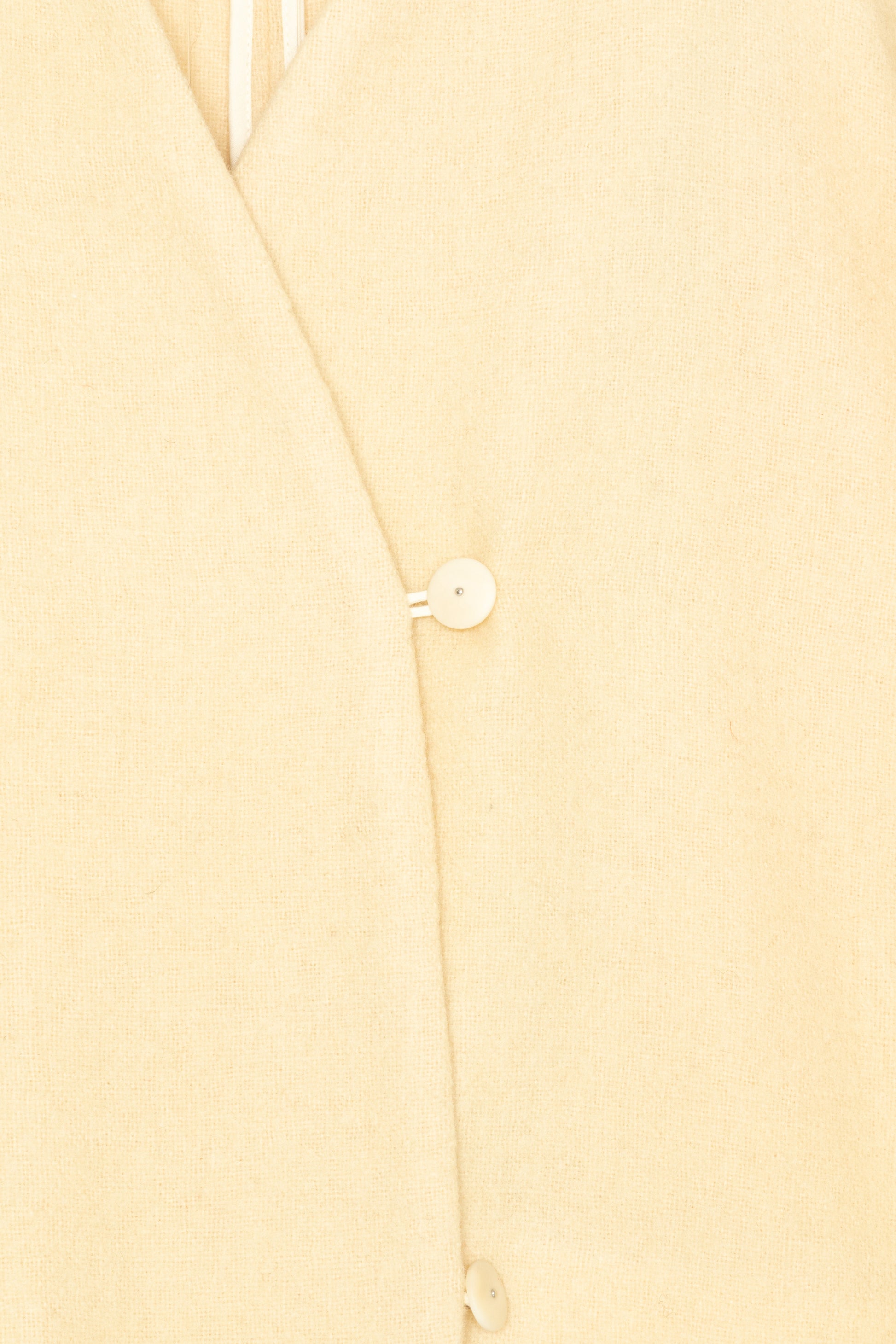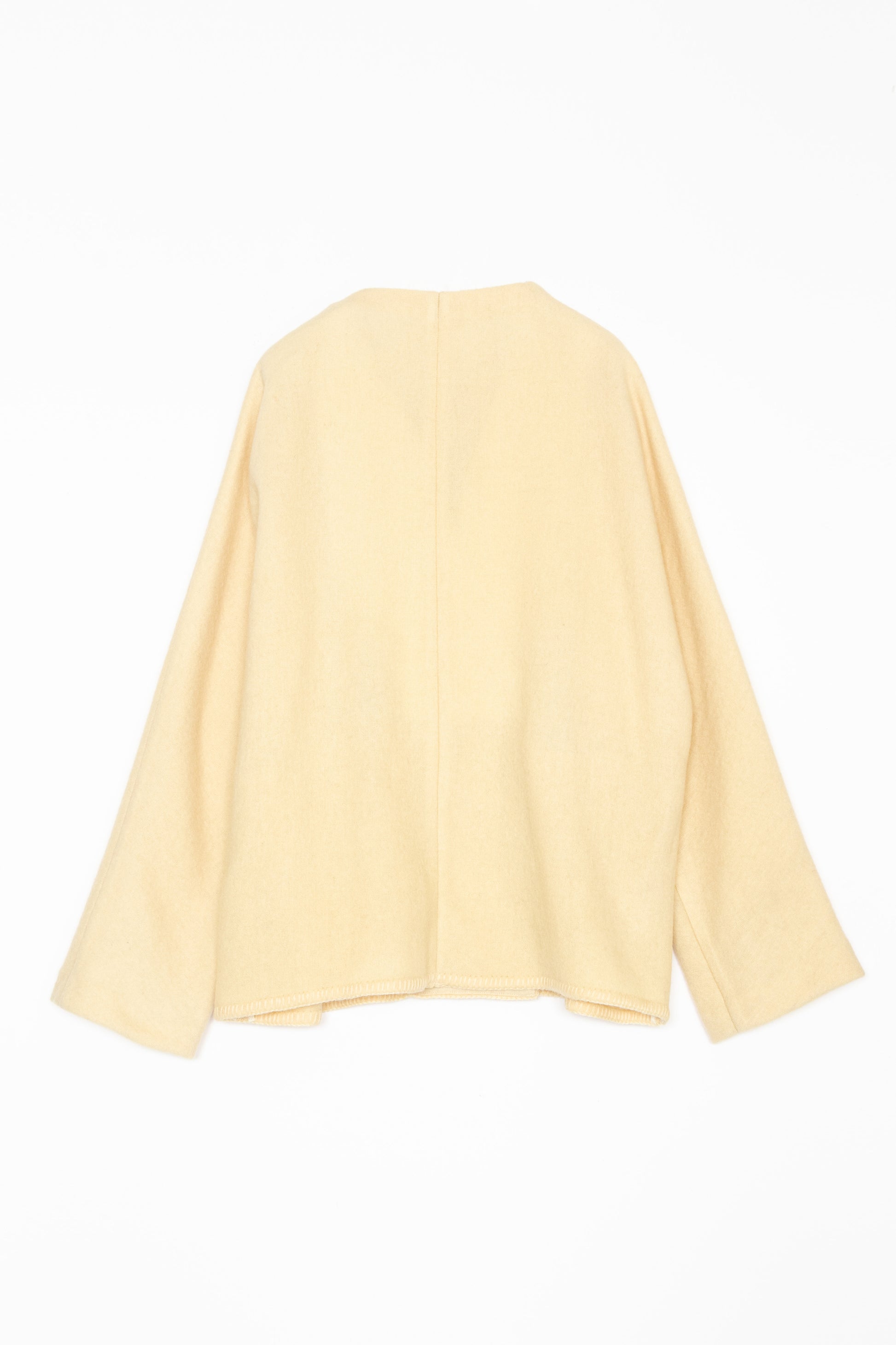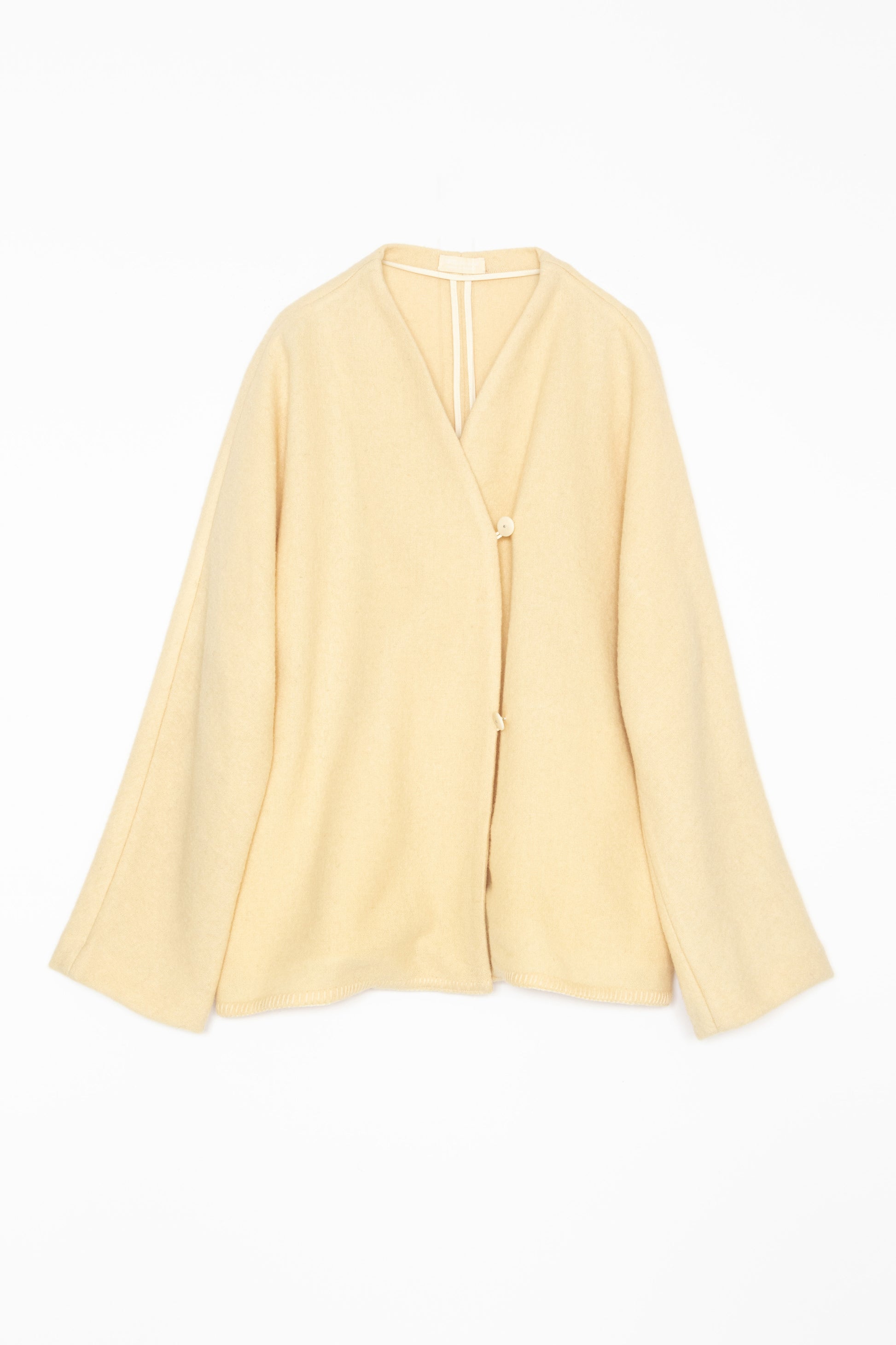 The chain stitching on the edge of the blanket fabric is used as is to create a relaxed-feeling jacket with kimono sleeves. Loop button front. Side pockets. Unlined binding.