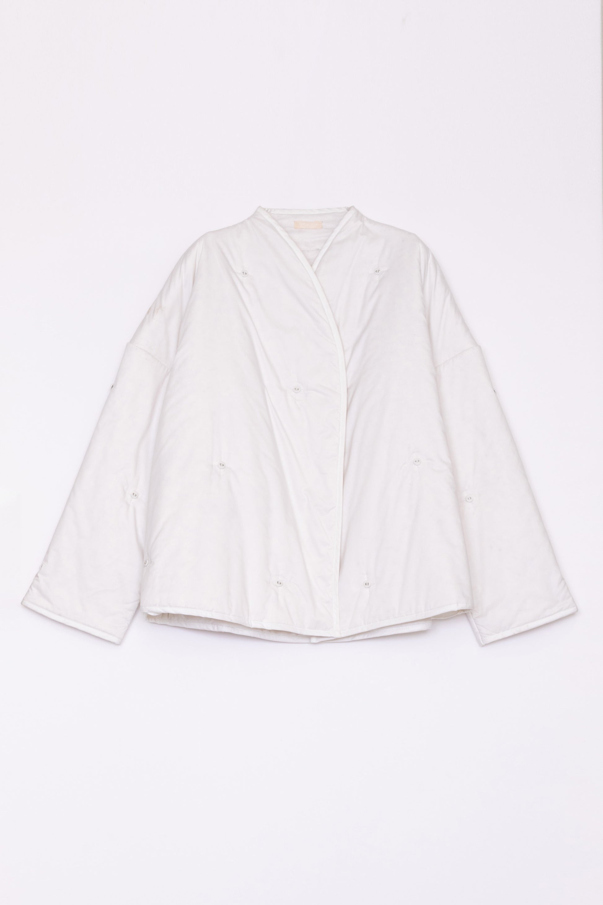 伝統的なボタンマットレスからインスピレーションを得て作られたジャケット。中綿入りで、クロスステッチとボタンのディテールが施されています。 サイドシームにポケットがついています。