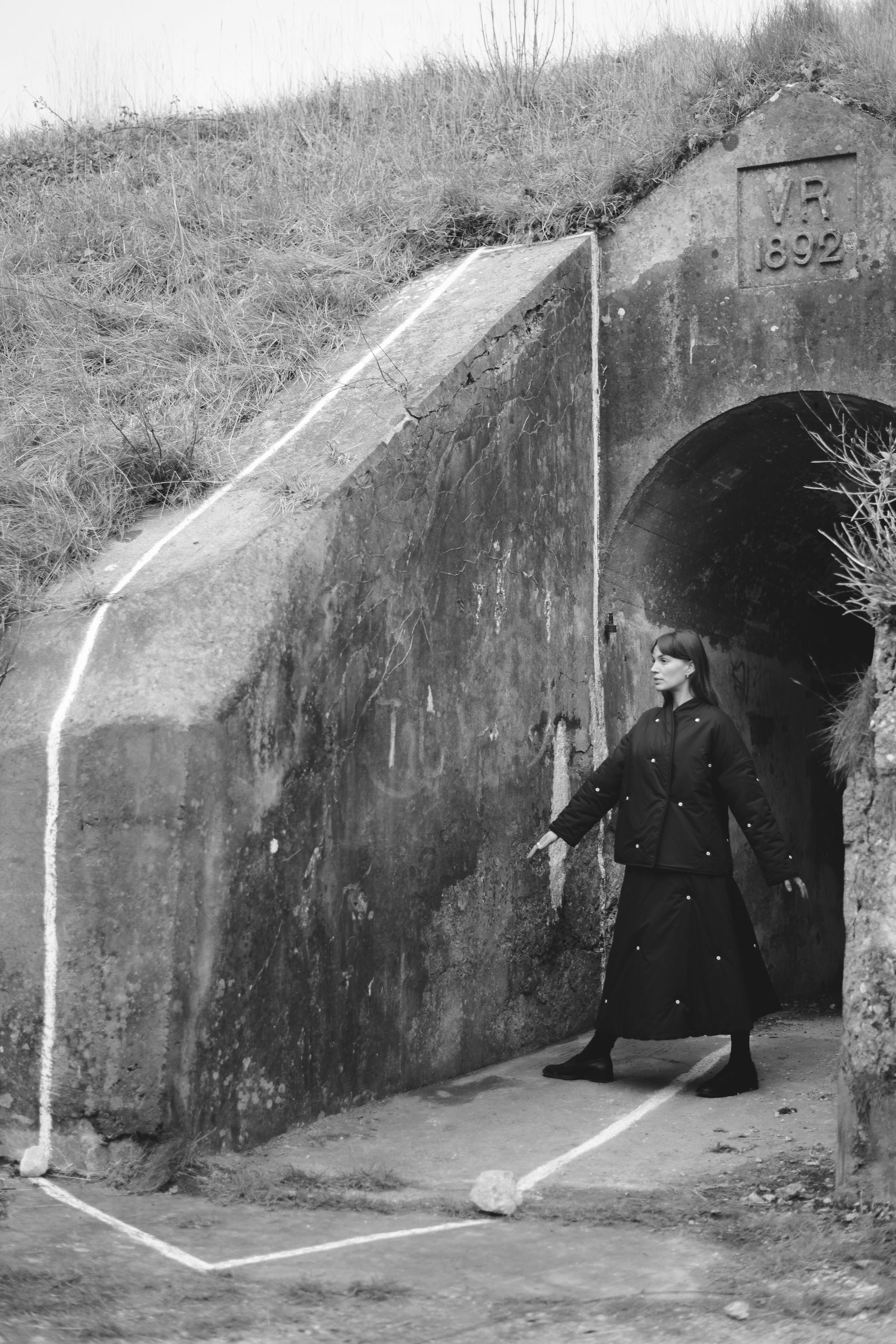 伝統的なボタンマットレスからインスピレーションを受けたスカート。中綿入りで、クロスステッチとボタンのディテールが施されています。