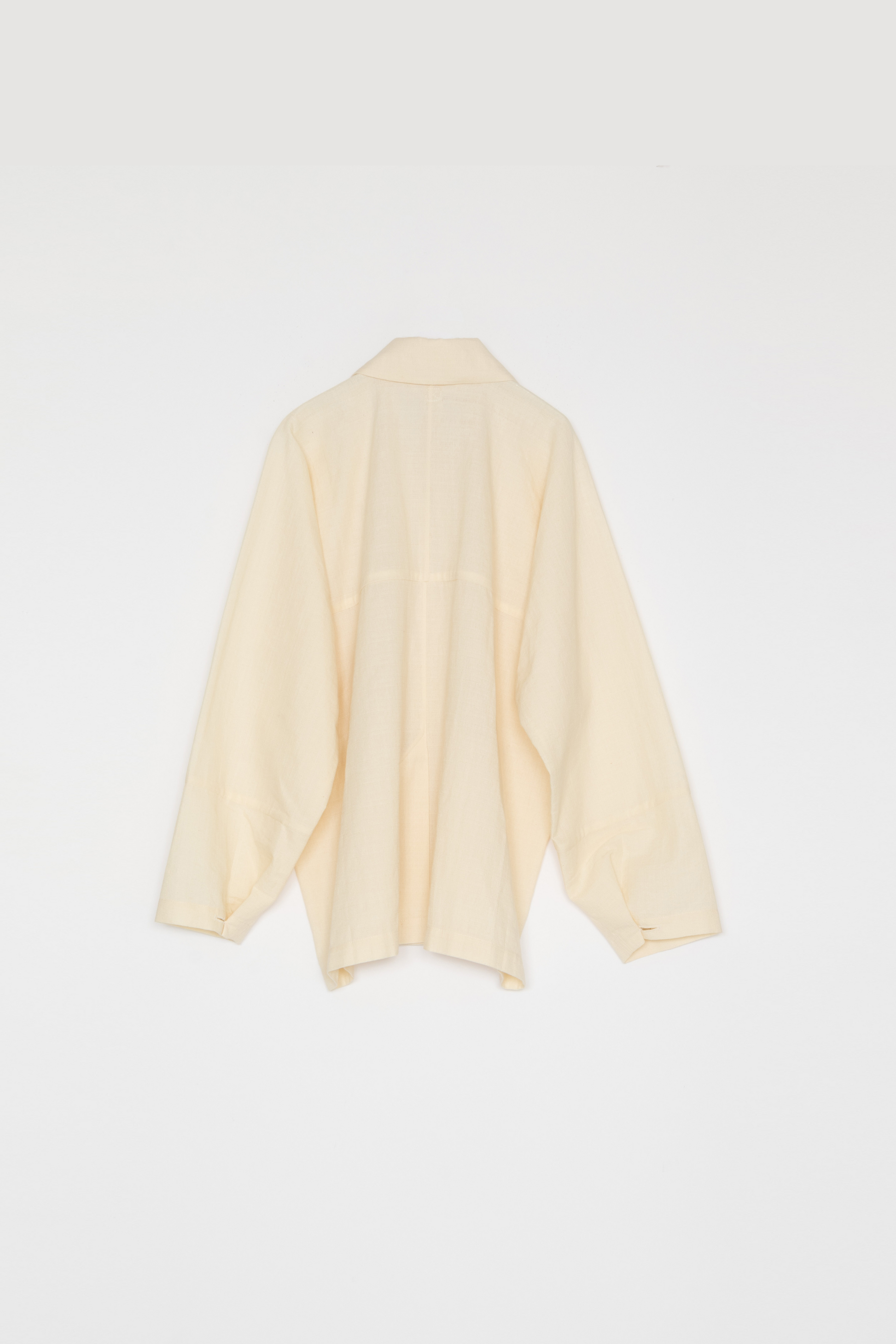 ユニセックスジャケット。アームホールや脇に縫い目のでない独自のカットにより、生地をあますことなく使用し、独特のパターンワークとシルエットに。