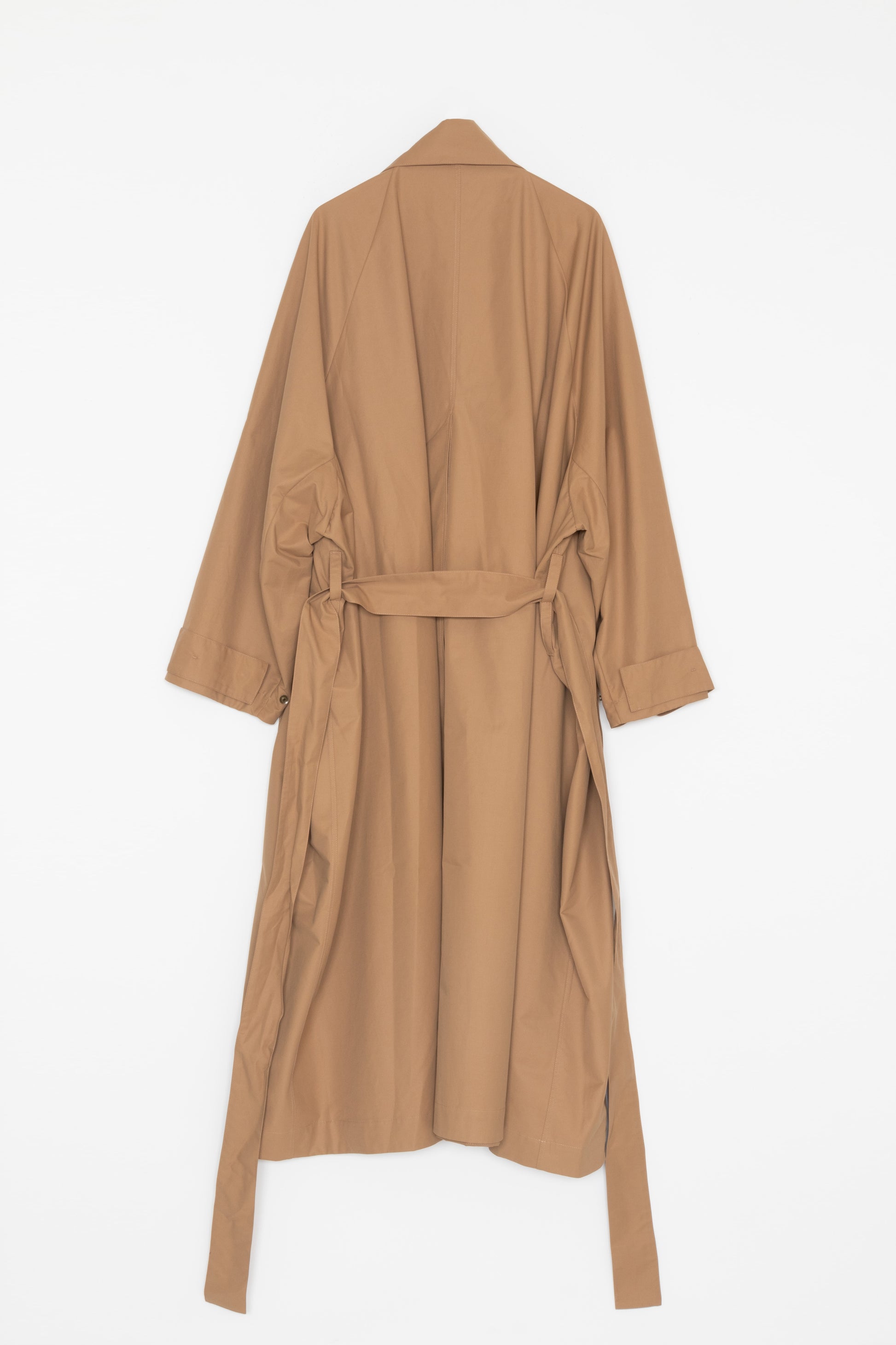 ベルト付きロングコート。 ベルトループが2段ついているので、ハイウエスト、ローウエストと使い分けることができます。また、ラグランスリーブにはカッティングが施されているので、そこへ腕を通して着用することも可能です。