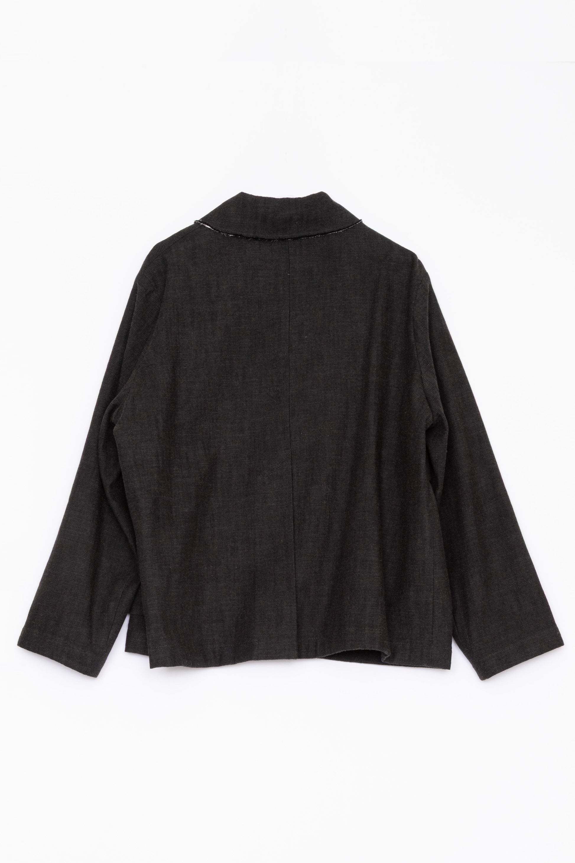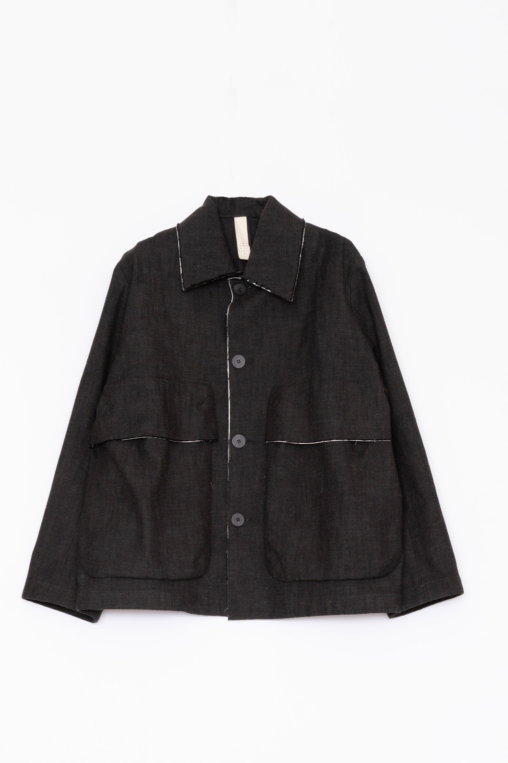 スクエア型の大きなフロントポケットがポイントのユニセックスジャケット。襟やフロント、ポケットなどに施されたカッティングが特徴です。『Wilhem Trousers』とのセットアップが可能です。