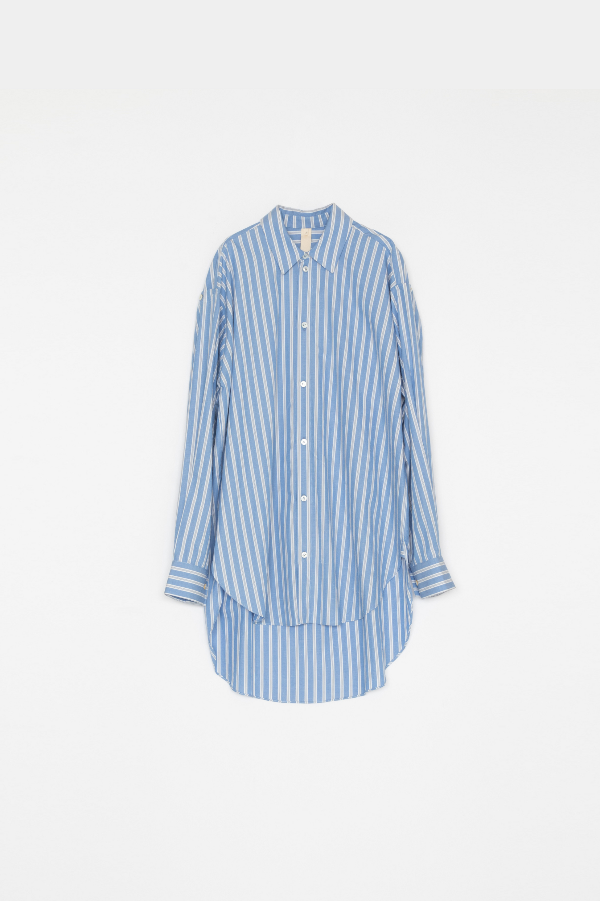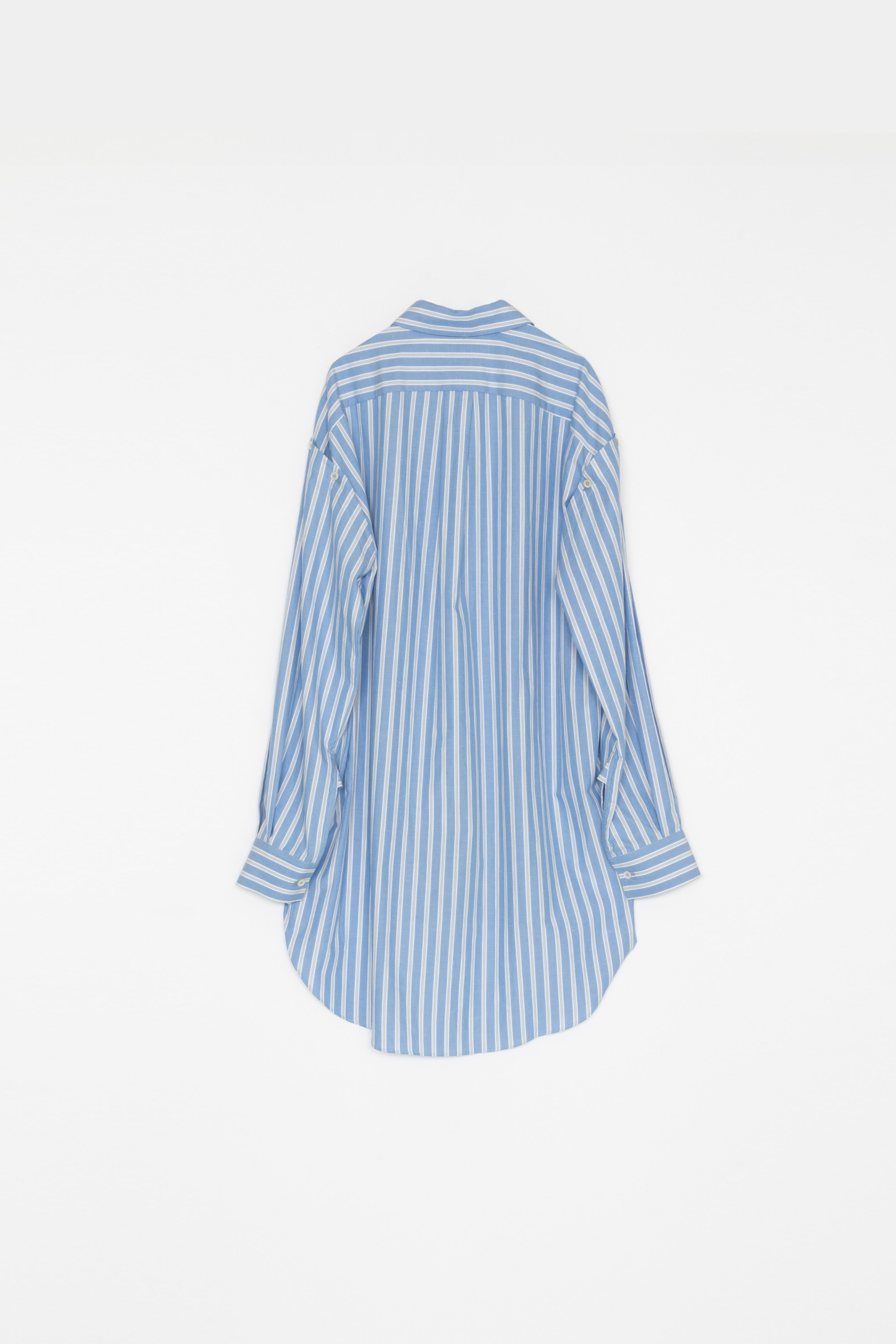 Unisex shirt. A 2-way design that allows you to wear it with the sleeves tied in the front by removing the button on the back of the armhole. 100% cotton striped fabric. A design that combines two types of striped fabric. The cuffs and side slits have gussets for a tough look.