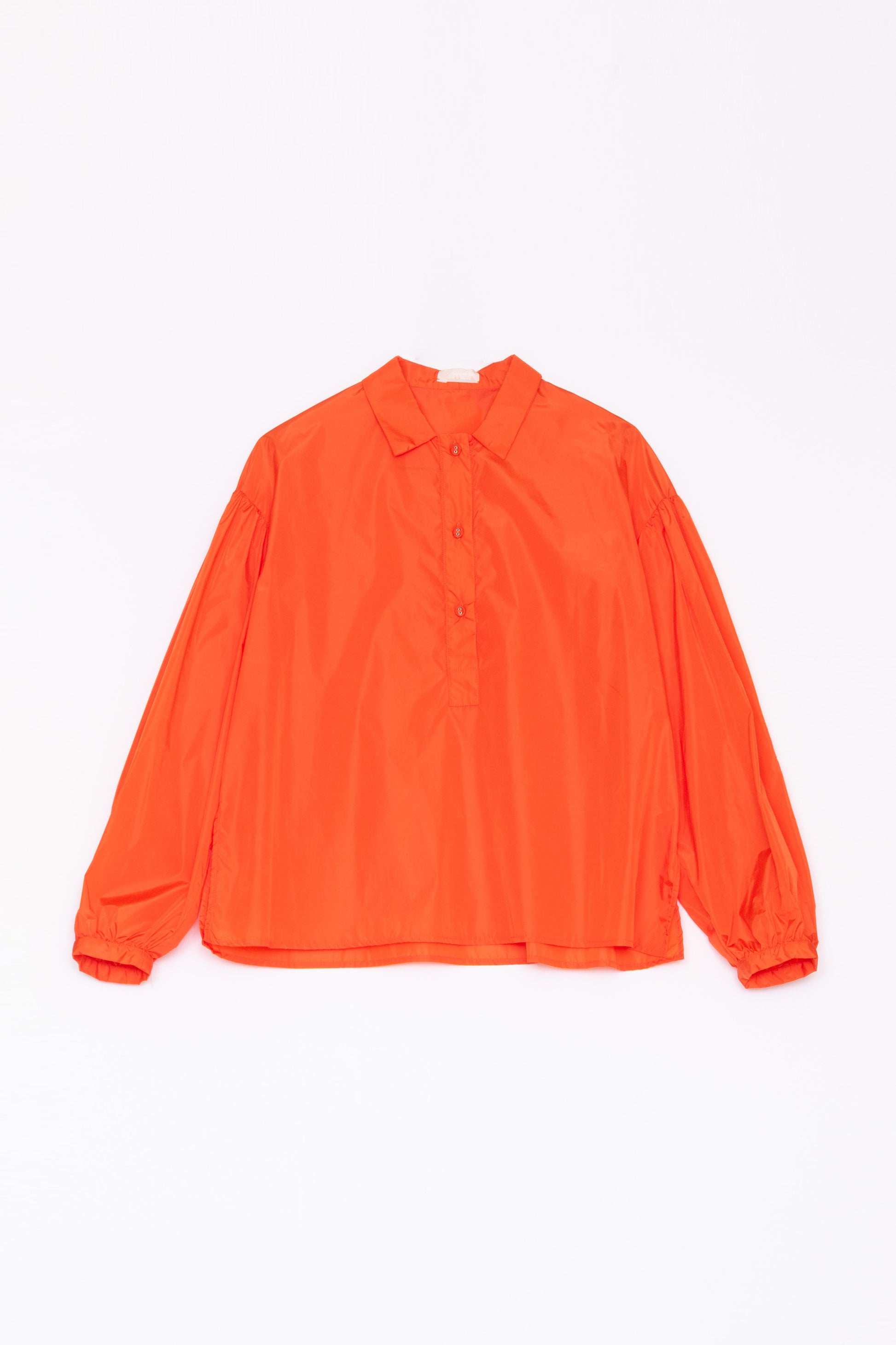 リラックスした雰囲気のプルオーバーシャツ。肩はドロップショルダー、袖にはギャザーが入っています。襟のうしろにスプリットが入っています。